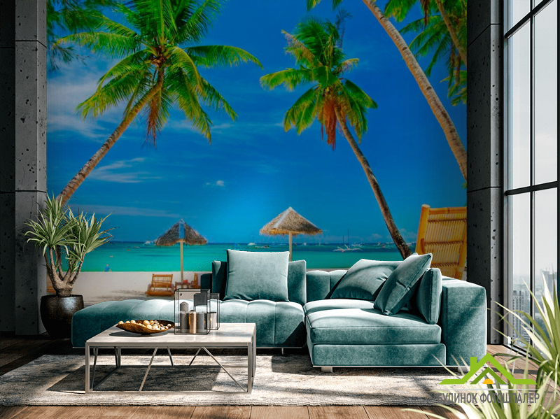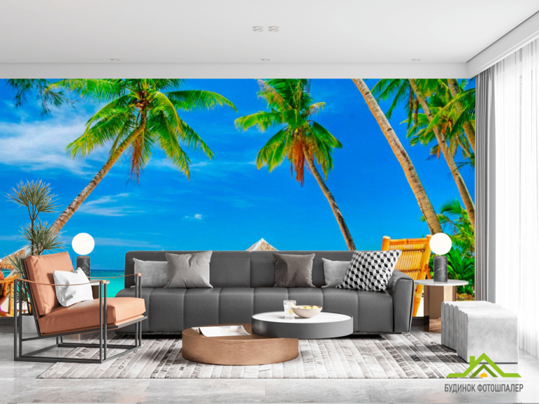 Фотообои Шезлонг, пальмы, пляж Фотообои Шезлонг, пальмы, пляж