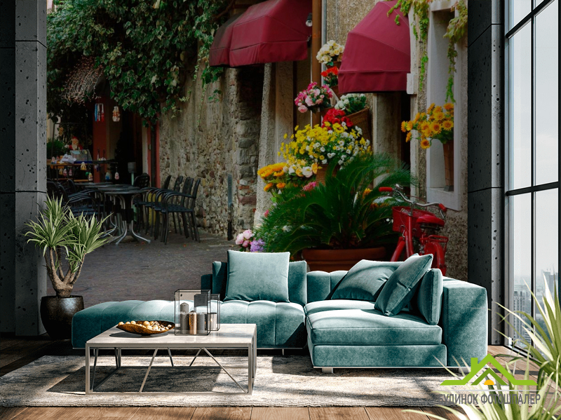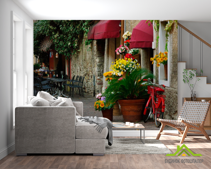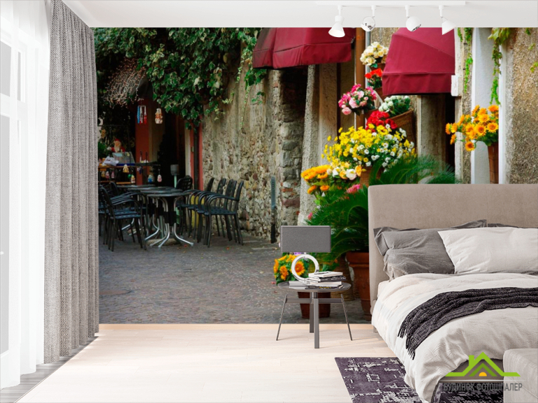 Фотообои Кафе на улочке с цветами Фотообои Кафе на улочке с цветами