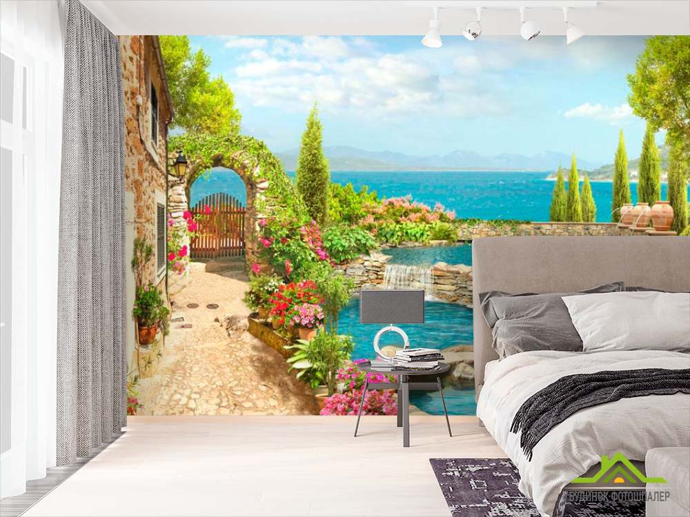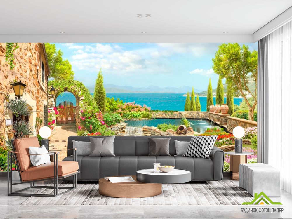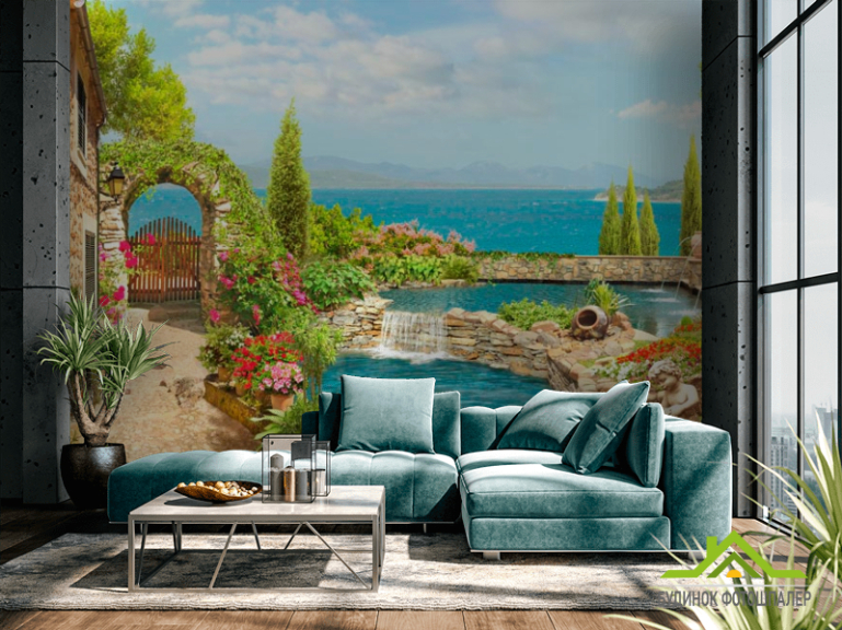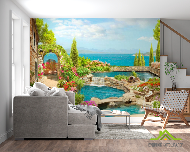 Фотообои Дом, фонтан, море