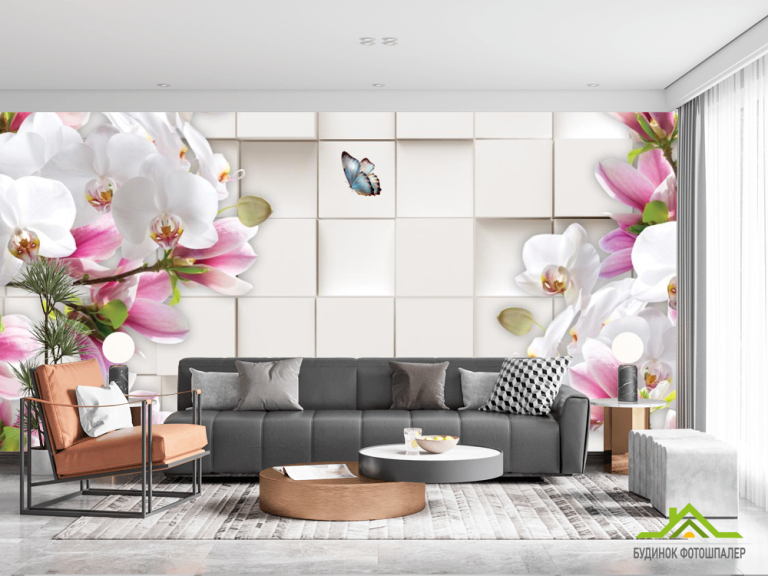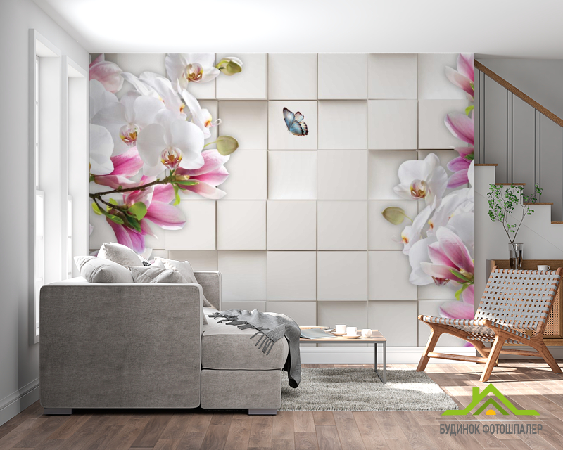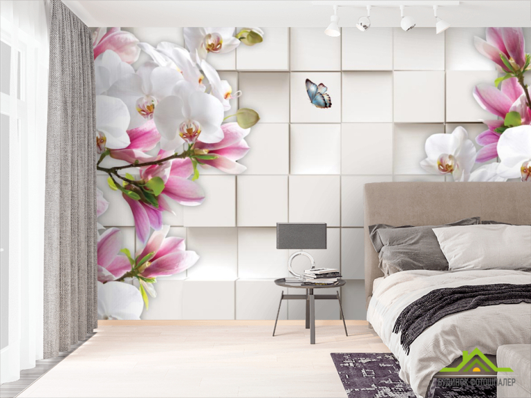 Фотообои Магнолии на фоне 3д квадратов Фотообои Магнолии на фоне 3д квадратов