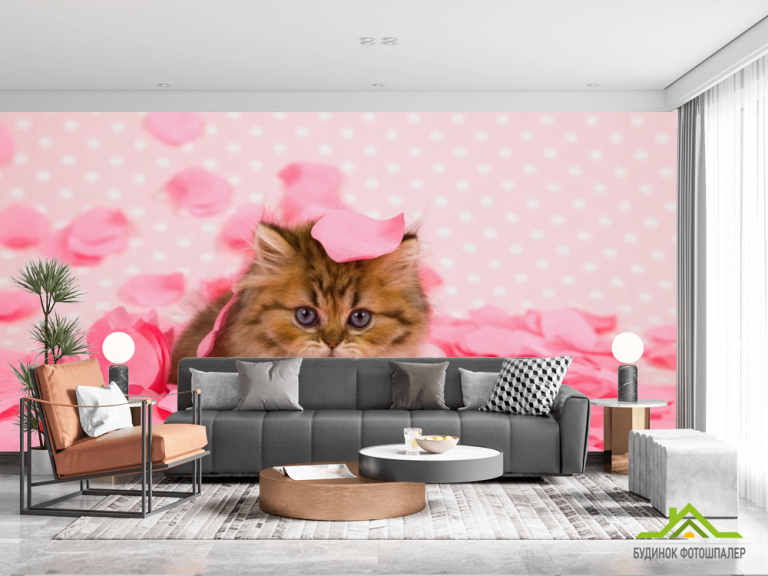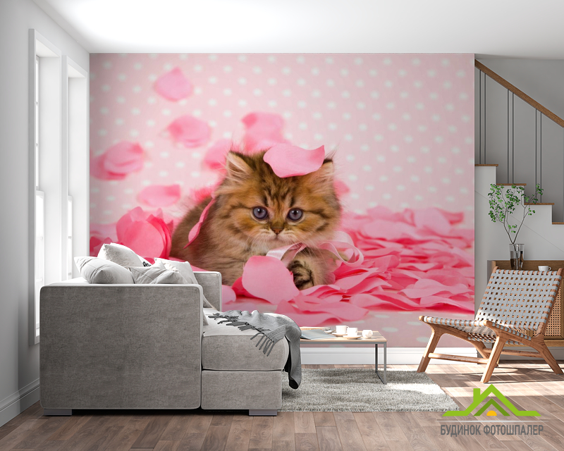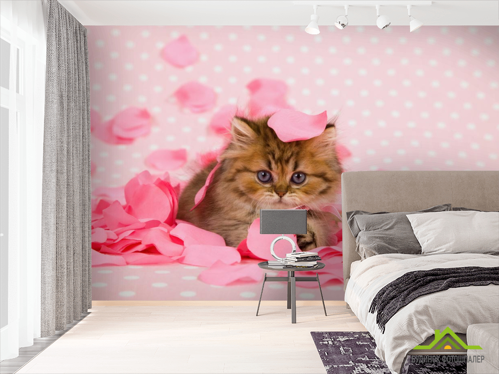 Фотообои котёнок в лепестках роз Фотообои котёнок в лепестках роз
