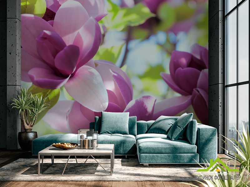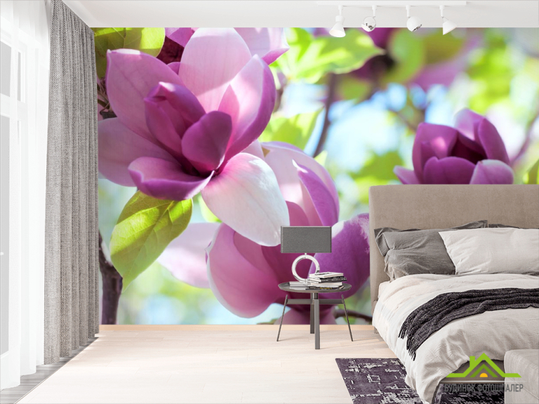 Фотообои бело-фиолетовые цветы на дереве Фотообои бело-фиолетовые цветы на дереве