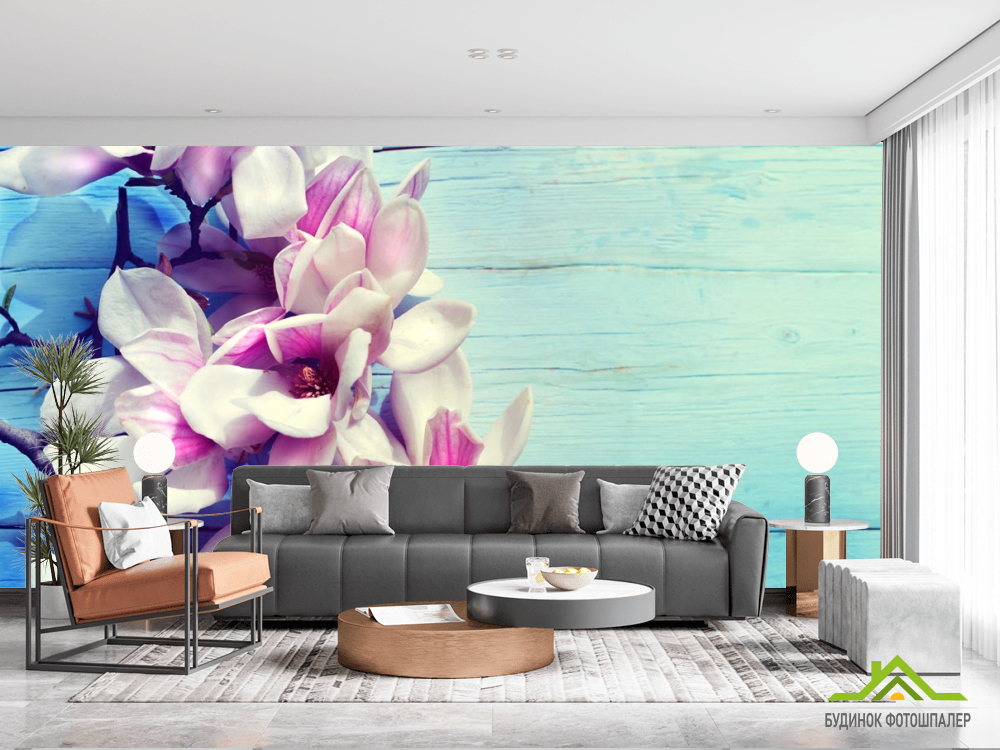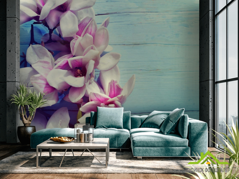 Фотообои цветы на голубом деревянном фоне
