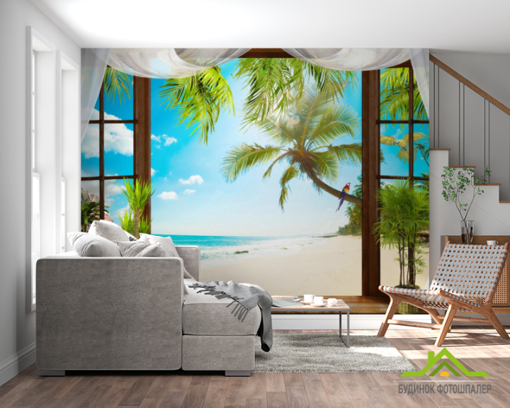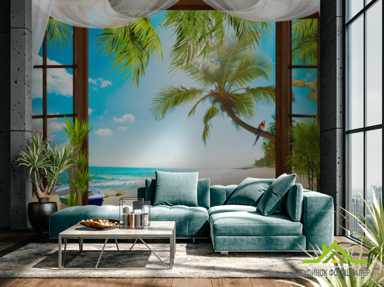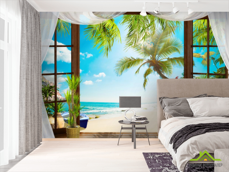 Фотообои Вид из окна на пальмы и море Фотообои Вид из окна на пальмы и море