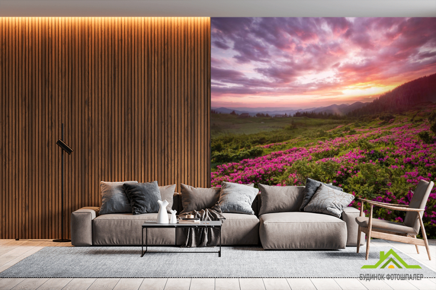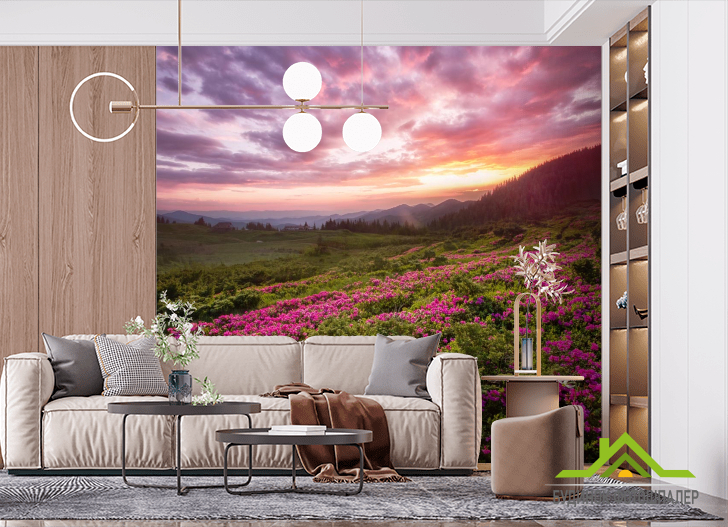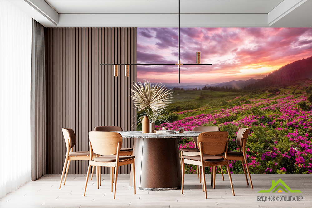 Фотообои закат над сиреневыми цветами