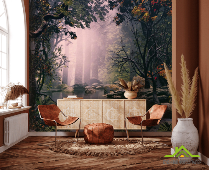 Фотообои туман в лесу над речкой Фотообои туман в лесу над речкой