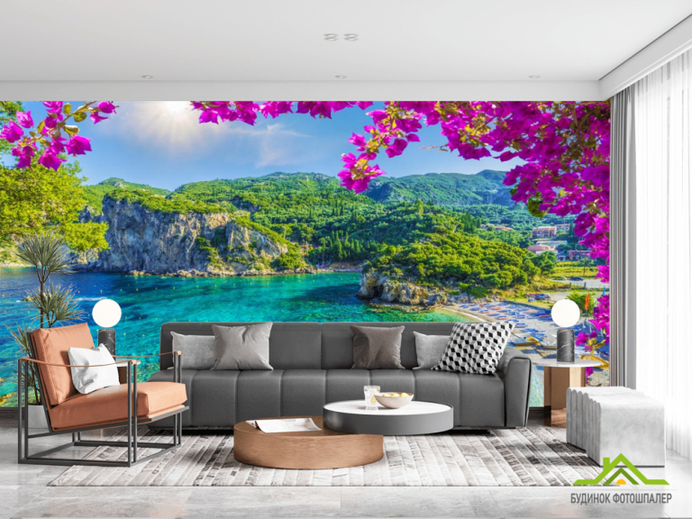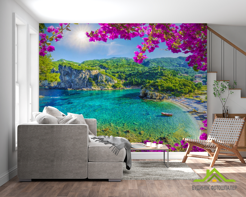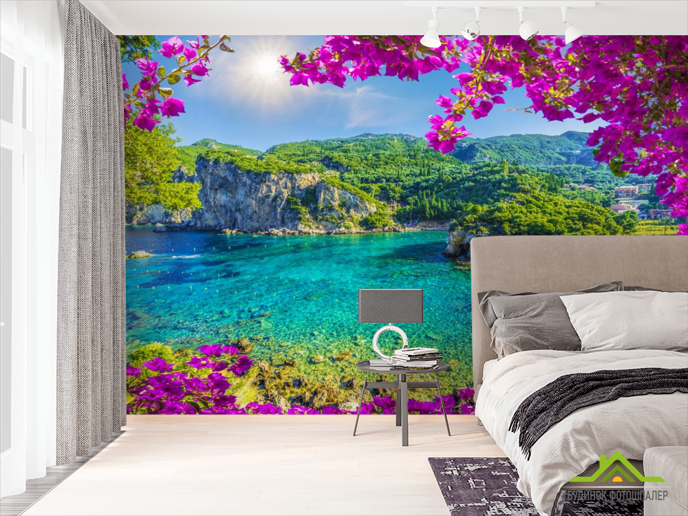 Фотообои вид на гавань через розовые ветки Фотообои вид на гавань через розовые ветки