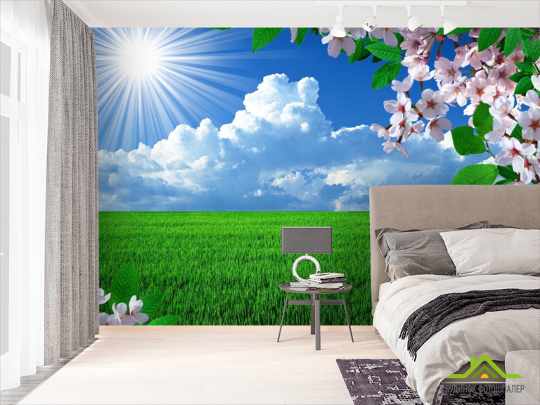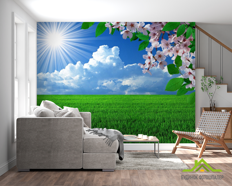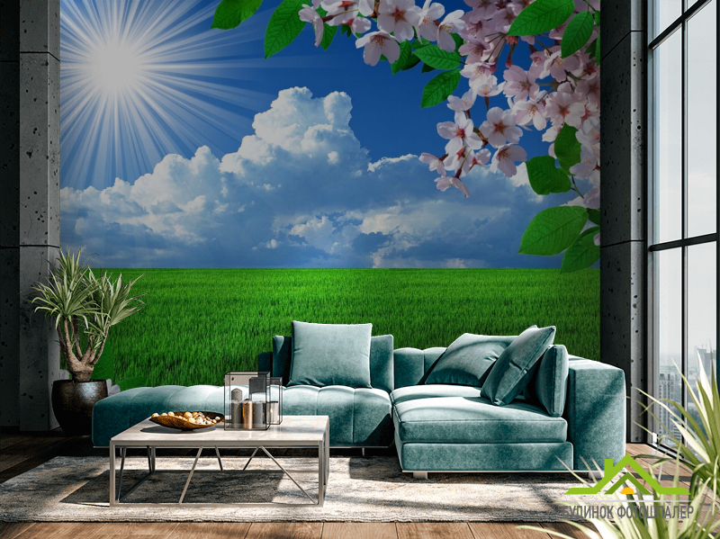 Фотообои абрикосовый цвет над зеленым полем Фотообои абрикосовый цвет над зеленым полем