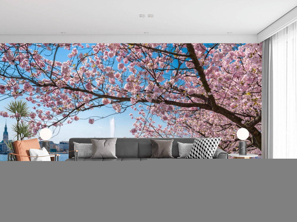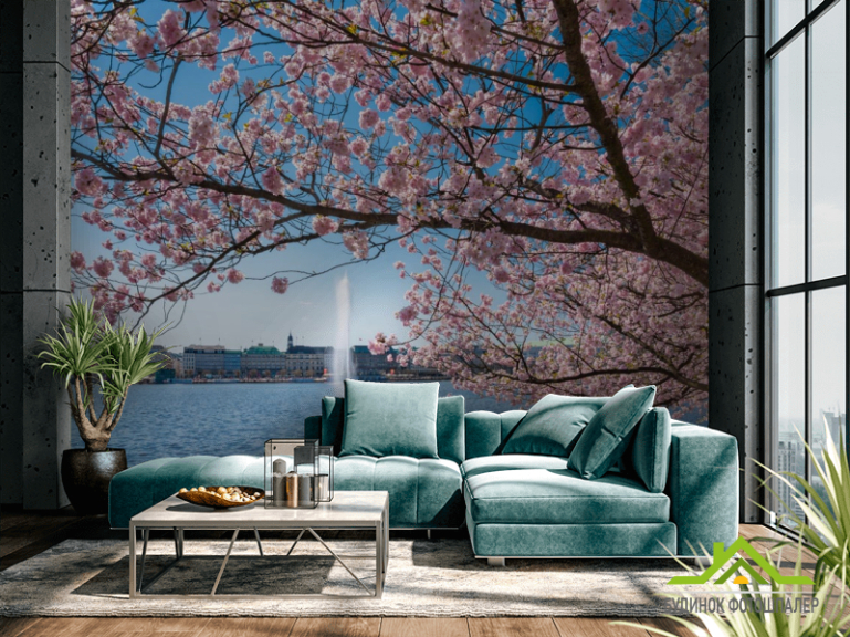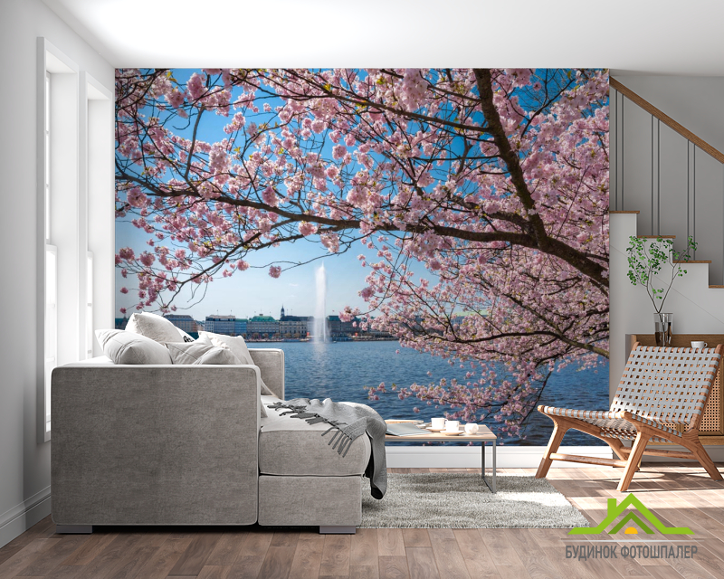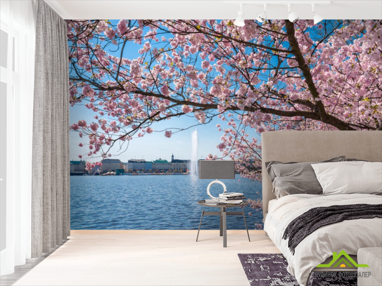 Фотообои сакура над рекой с фонтаном Фотообои сакура над рекой с фонтаном