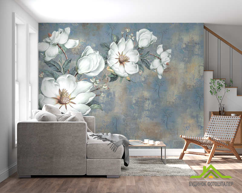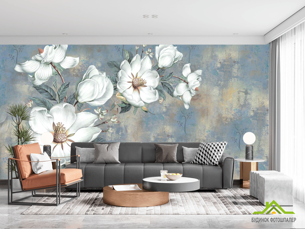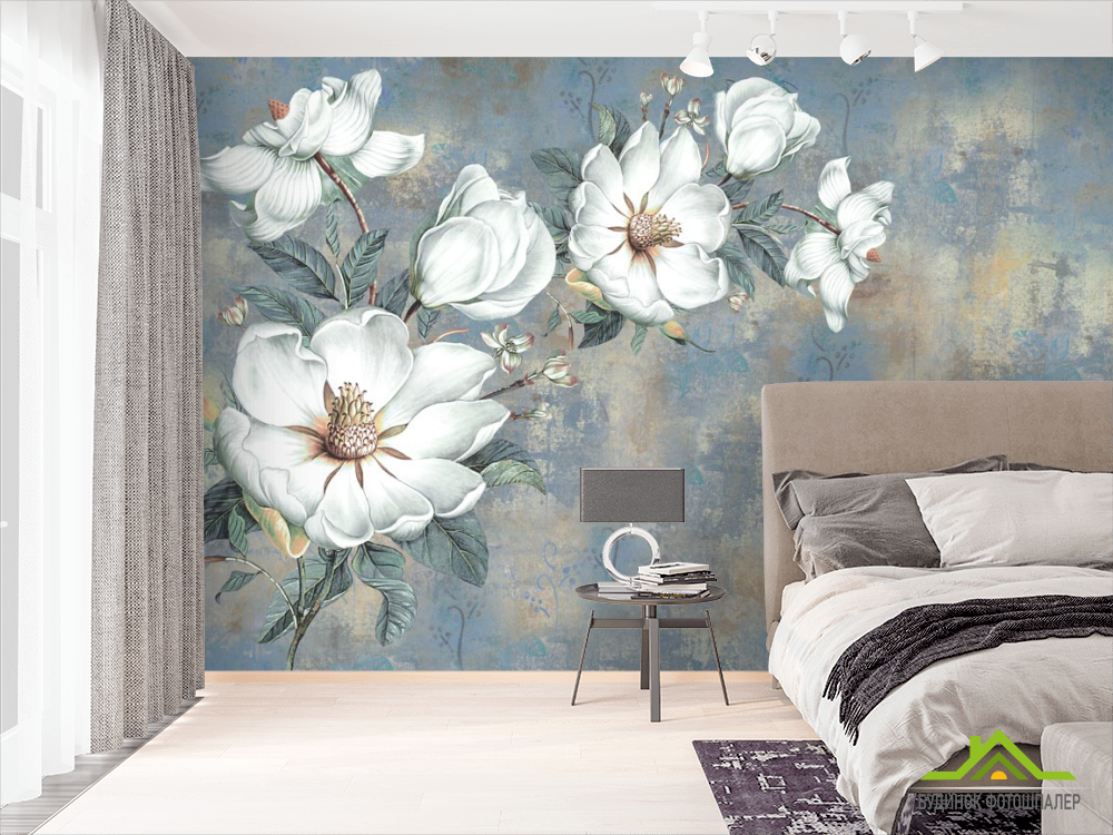 Фотообои Белые цветы на голубом фоне Фотообои Белые цветы на голубом фоне