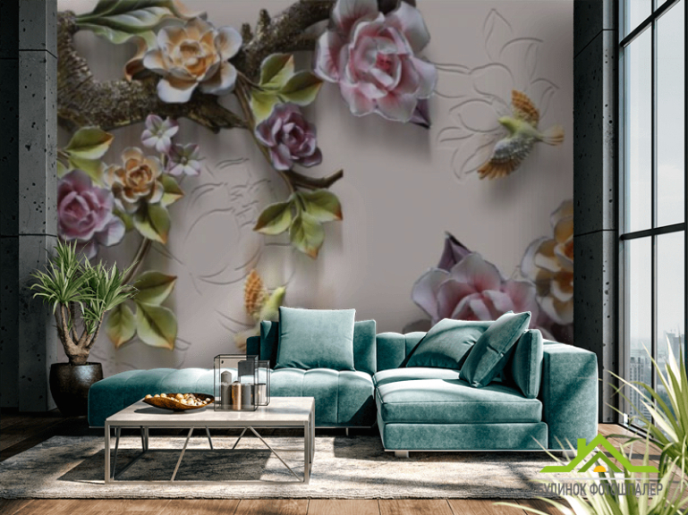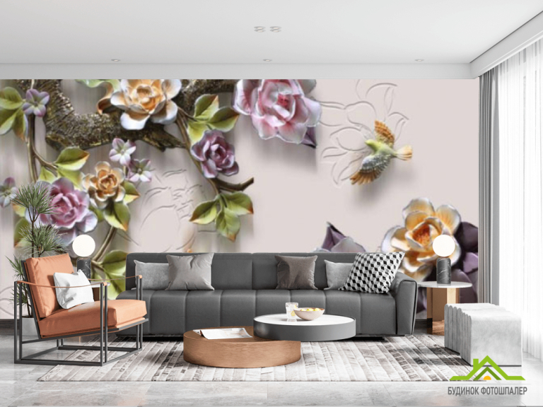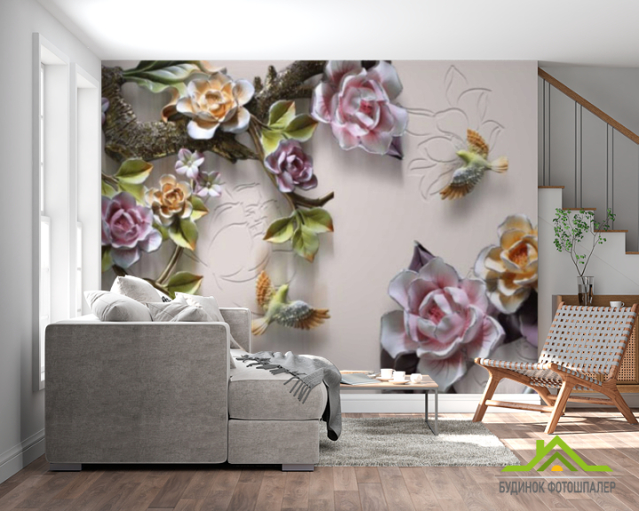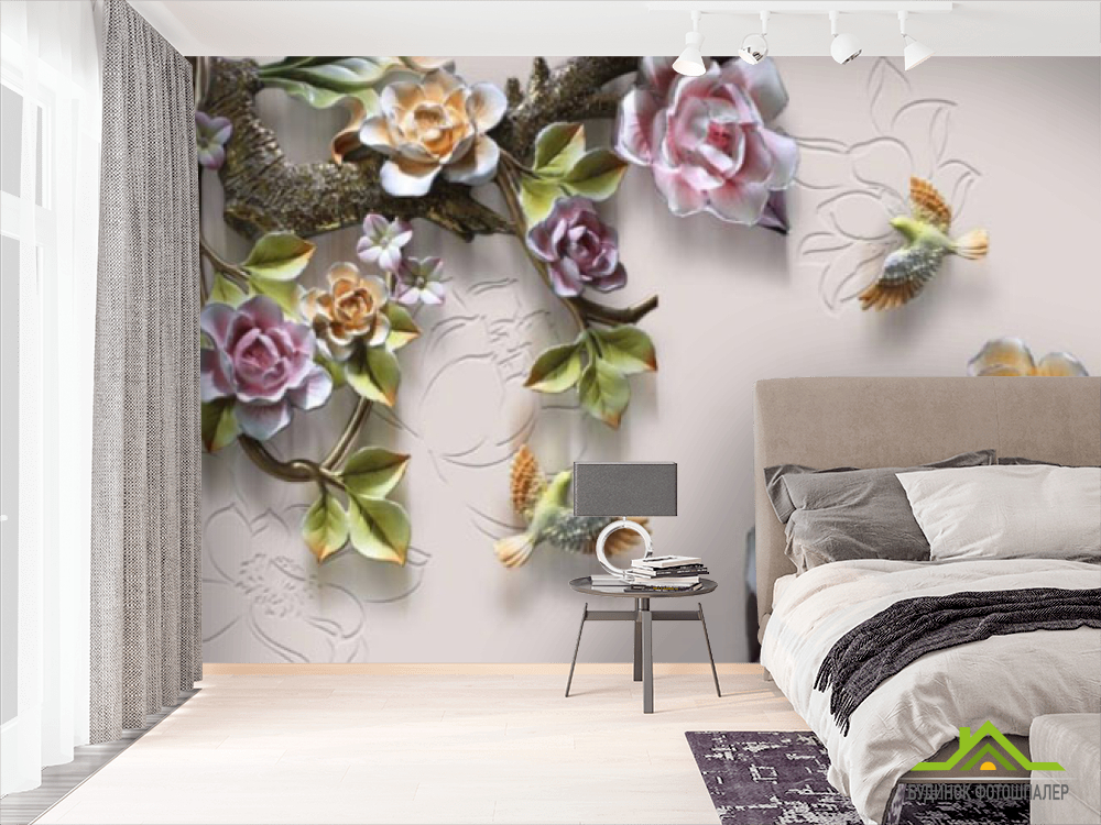 Фотообои Цветы на ветке и птицы Фотообои Цветы на ветке и птицы
