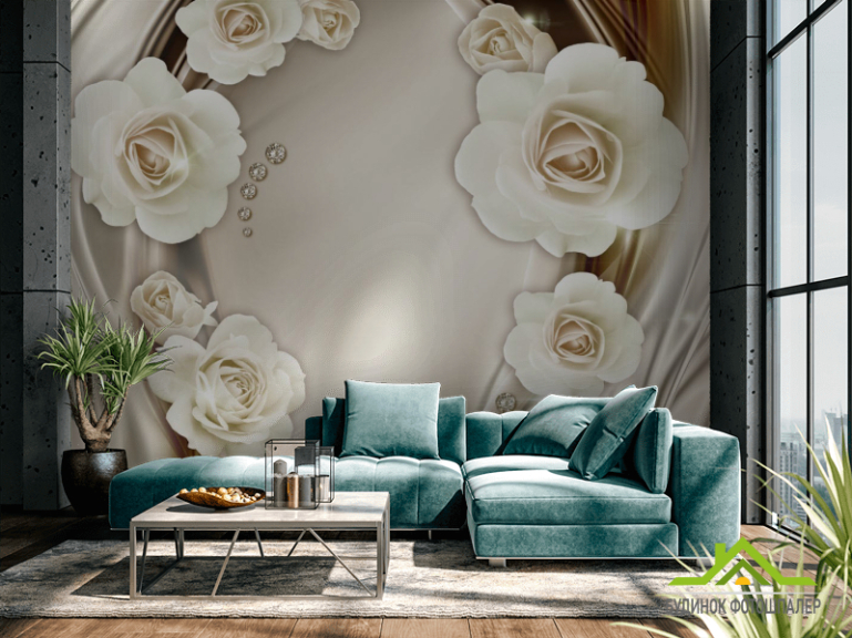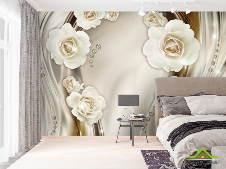 Фотообои Белые 3д цветы с камнями Фотообои Белые 3д цветы с камнями