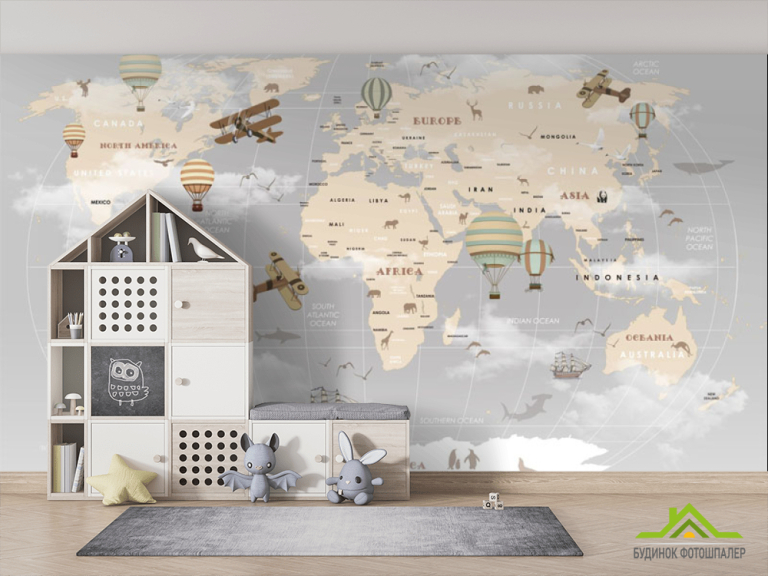 Фотообои Серая карта с детскими континентами на английском Фотообои Серая карта с детскими континентами на английском