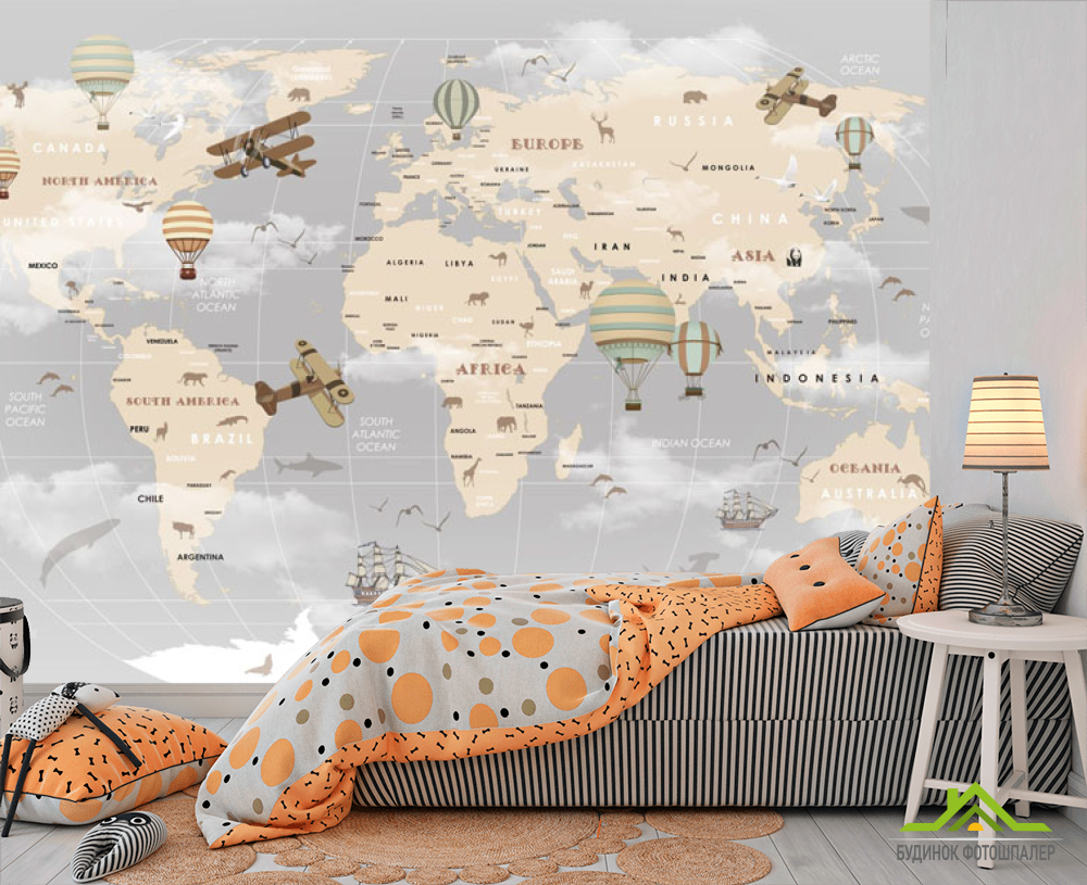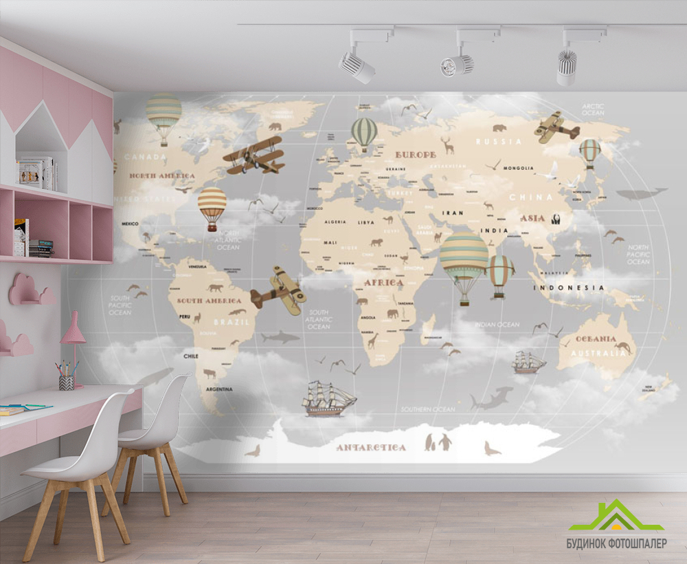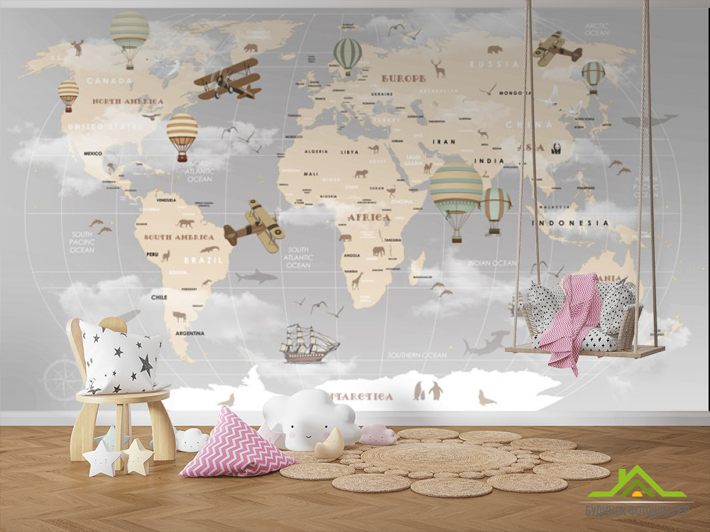 Фотообои Серая карта с детскими континентами на английском