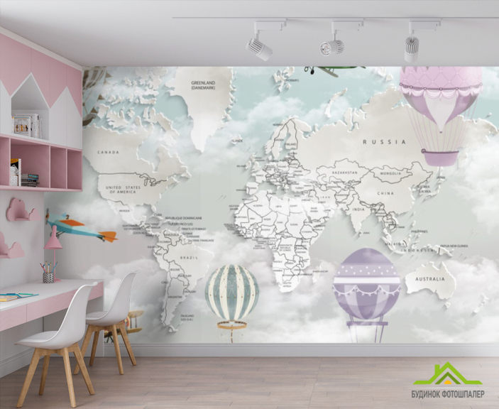 Фотообои 3д детская карта с воздушными шарами на английском языке Фотообои 3д детская карта с воздушными шарами на английском языке