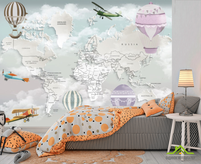 Фотообои 3д детская карта с воздушными шарами на английском языке
