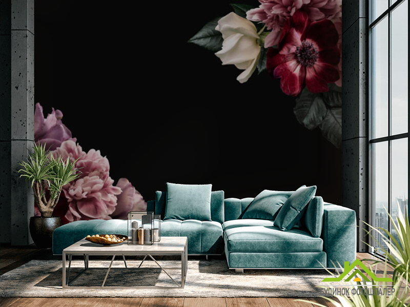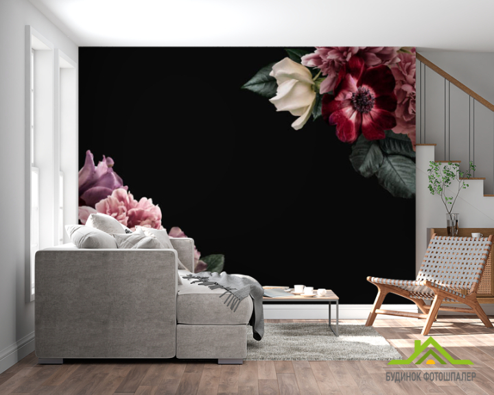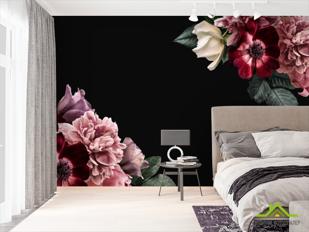 Фотообои Цветочный микс на чёрном Фотообои Цветочный микс на чёрном