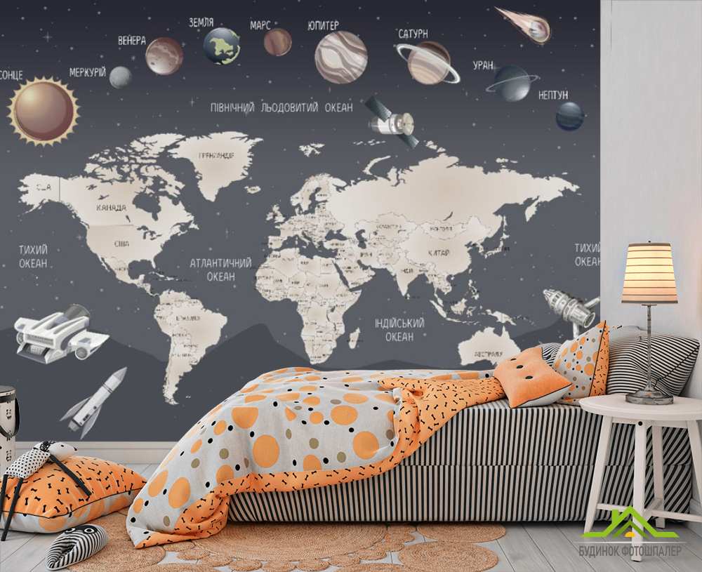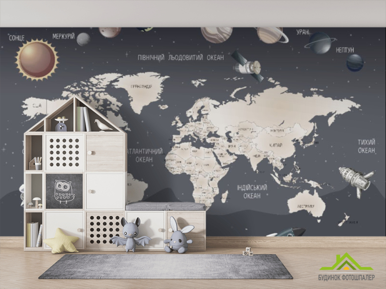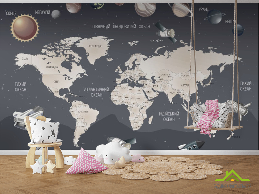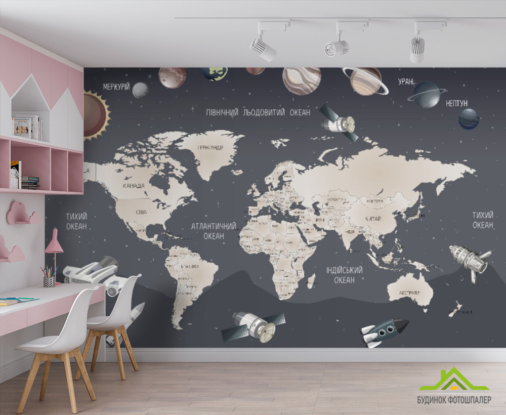 Фотообои Карта детская серая с планетами на украинском Фотообои Карта детская серая с планетами на украинском