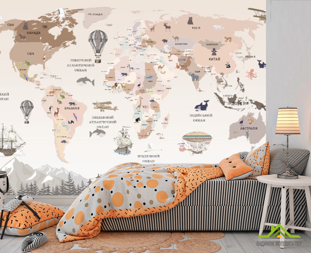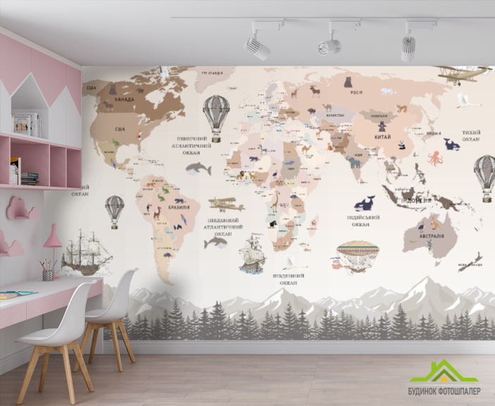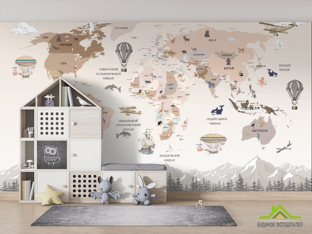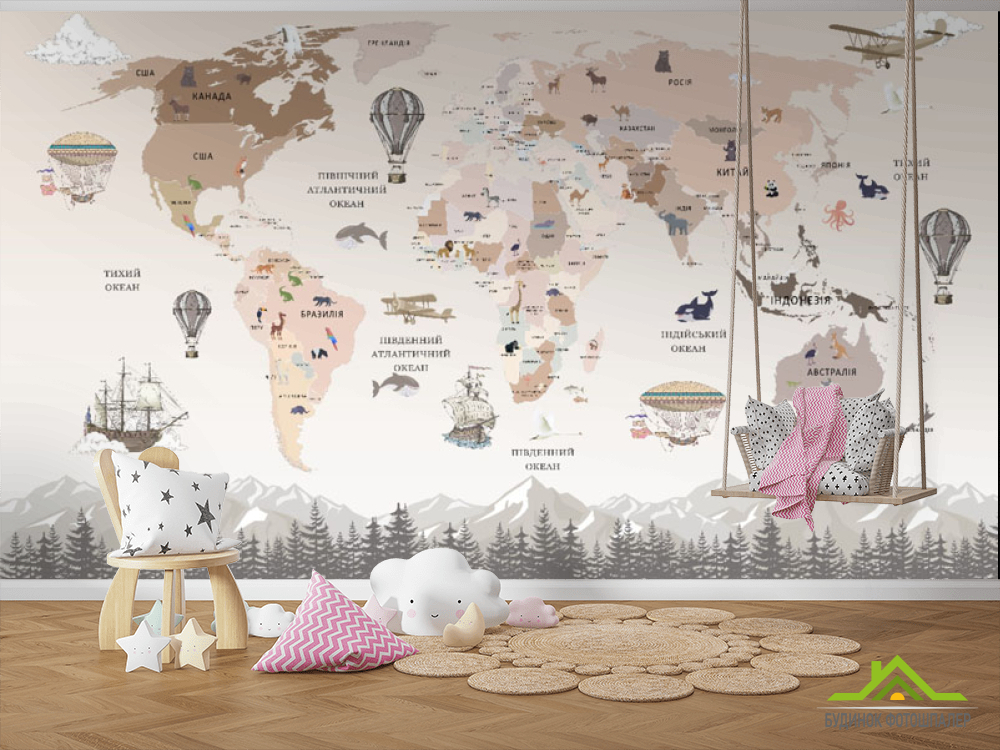 Фотообои Бежевая карта детская с горами и летающими шарами и самолетами Фотообои Бежевая карта детская с горами и летающими шарами и самолетами