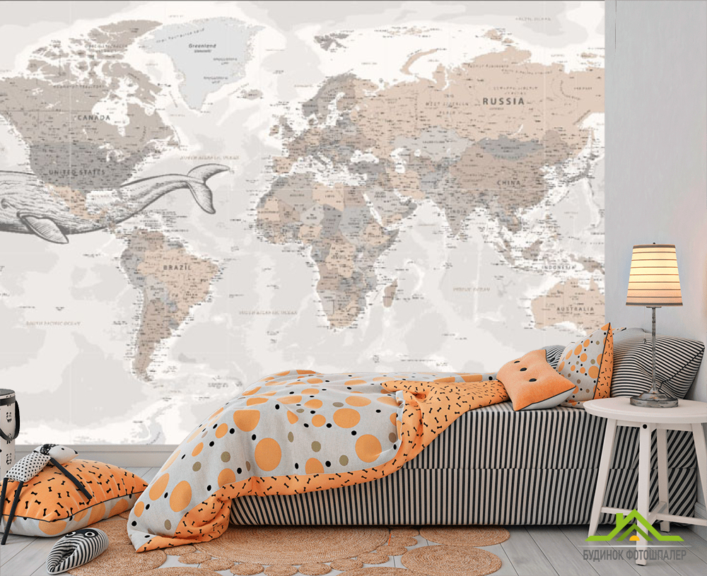 Фотообои Бежевая карта с китом на английском