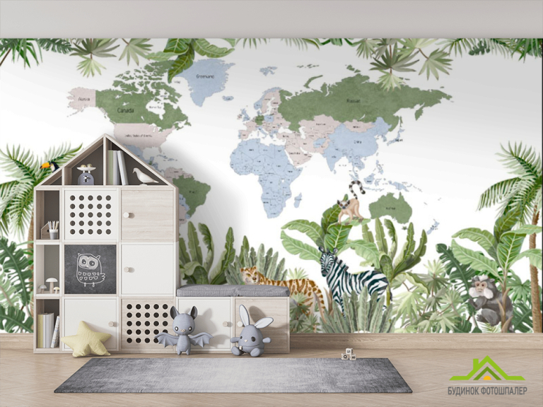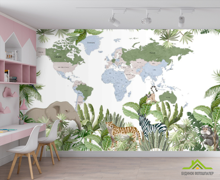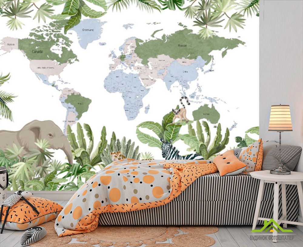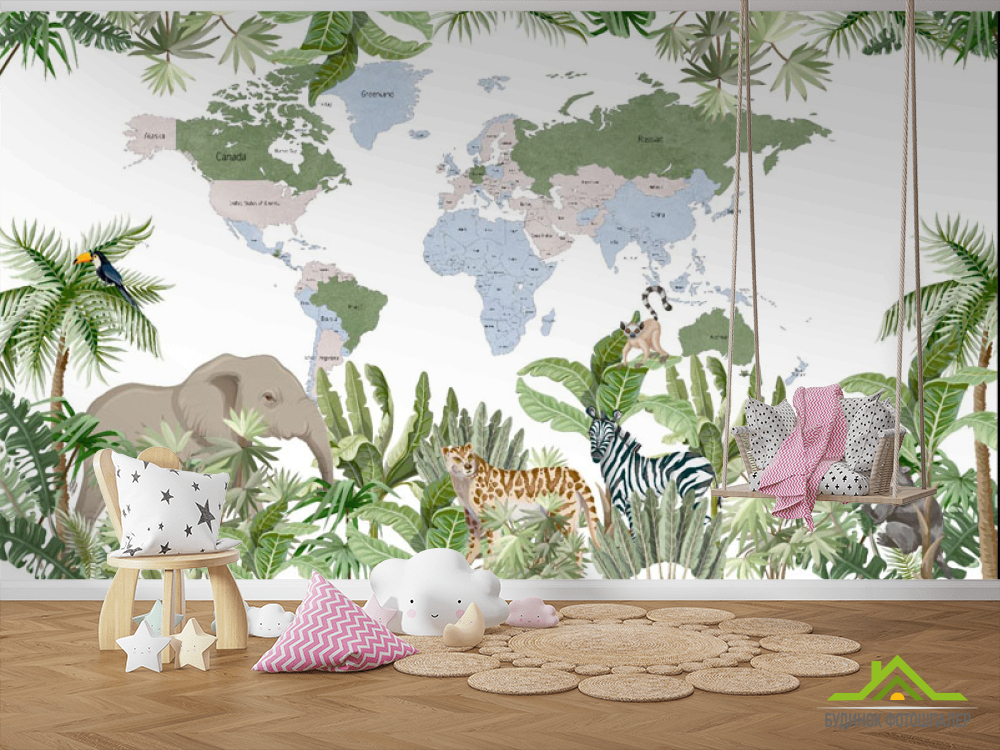 Фотообои Карта детская с тропическим лесом и животными на английском