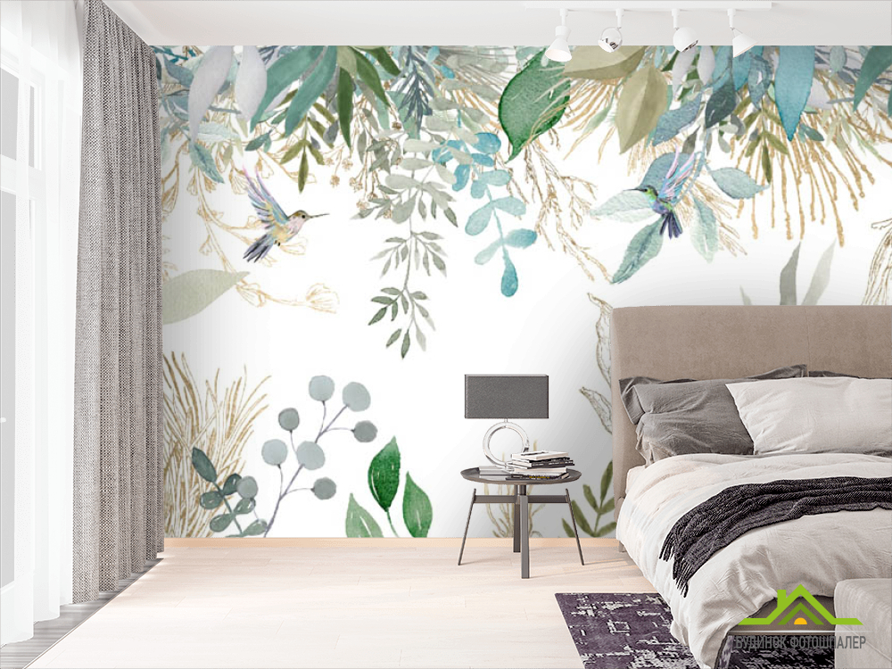 Фотообои Листья птропические и колибри Фотообои Листья птропические и колибри