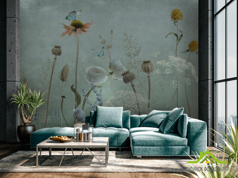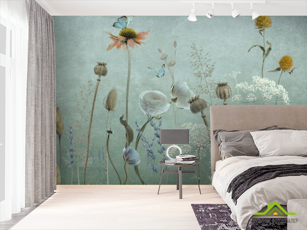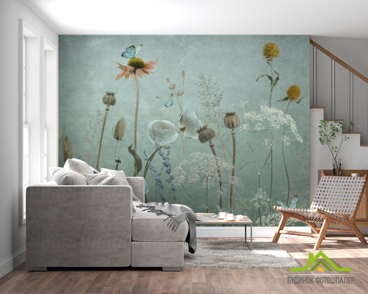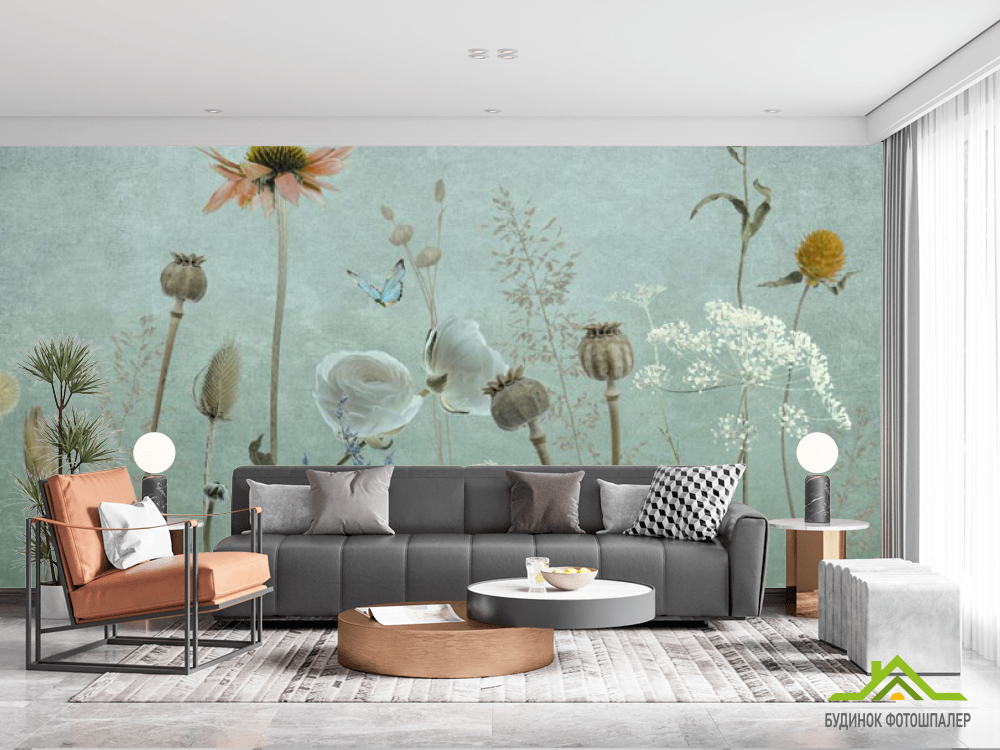Фотообои Полевые дизайнерские цветы зеленые Фотообои Полевые дизайнерские цветы зеленые