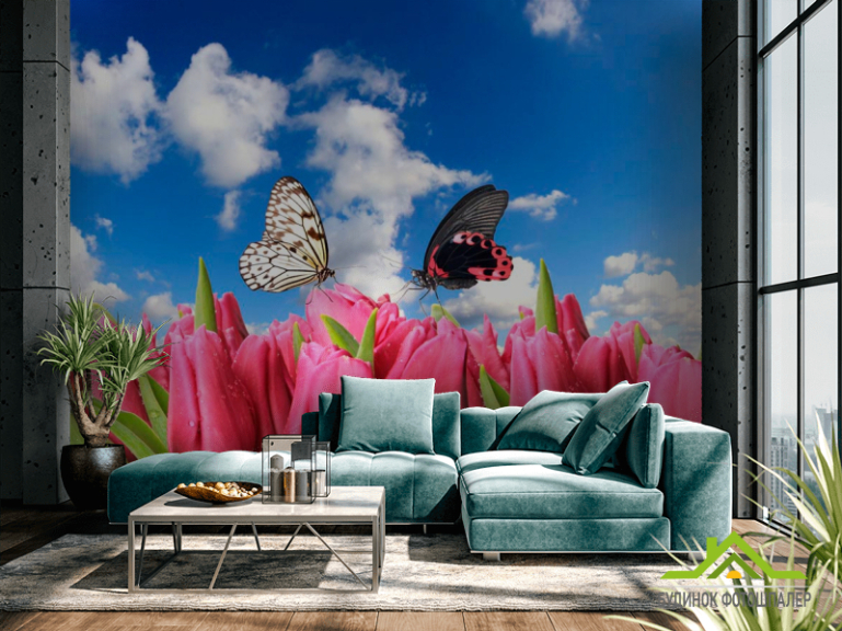 Фотошпалери Метелики і рожеві тюльпани Фотошпалери Метелики і рожеві тюльпани