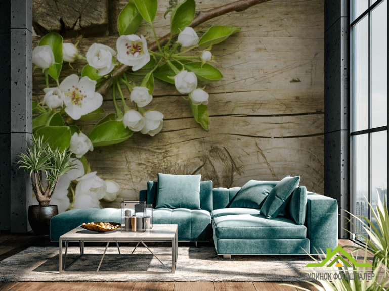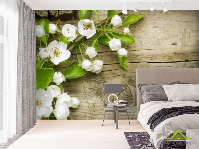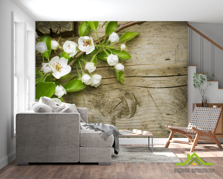 Фотошпалери білі цветоки на тлі дерев'яно