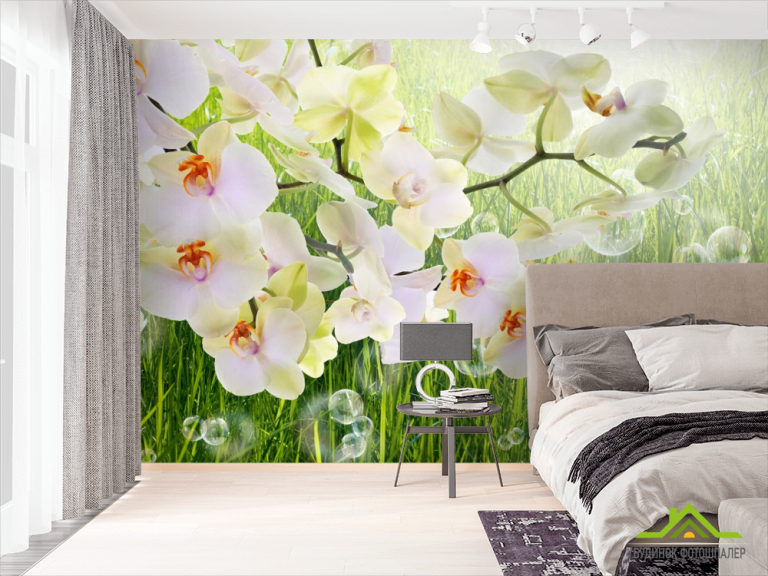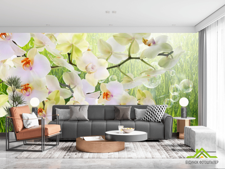 Фотошпалери біла орхідея на тлі трави Фотошпалери біла орхідея на тлі трави