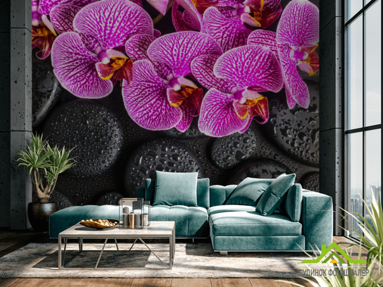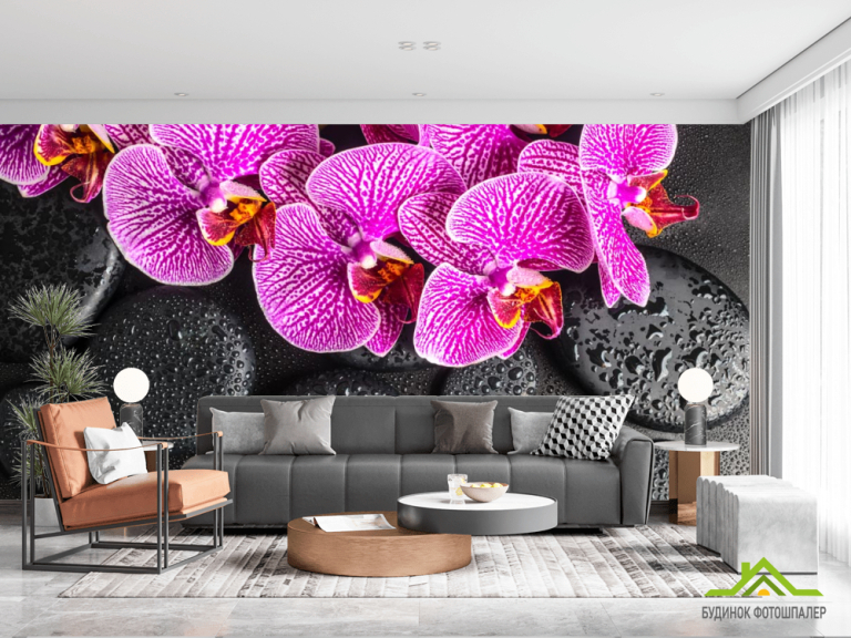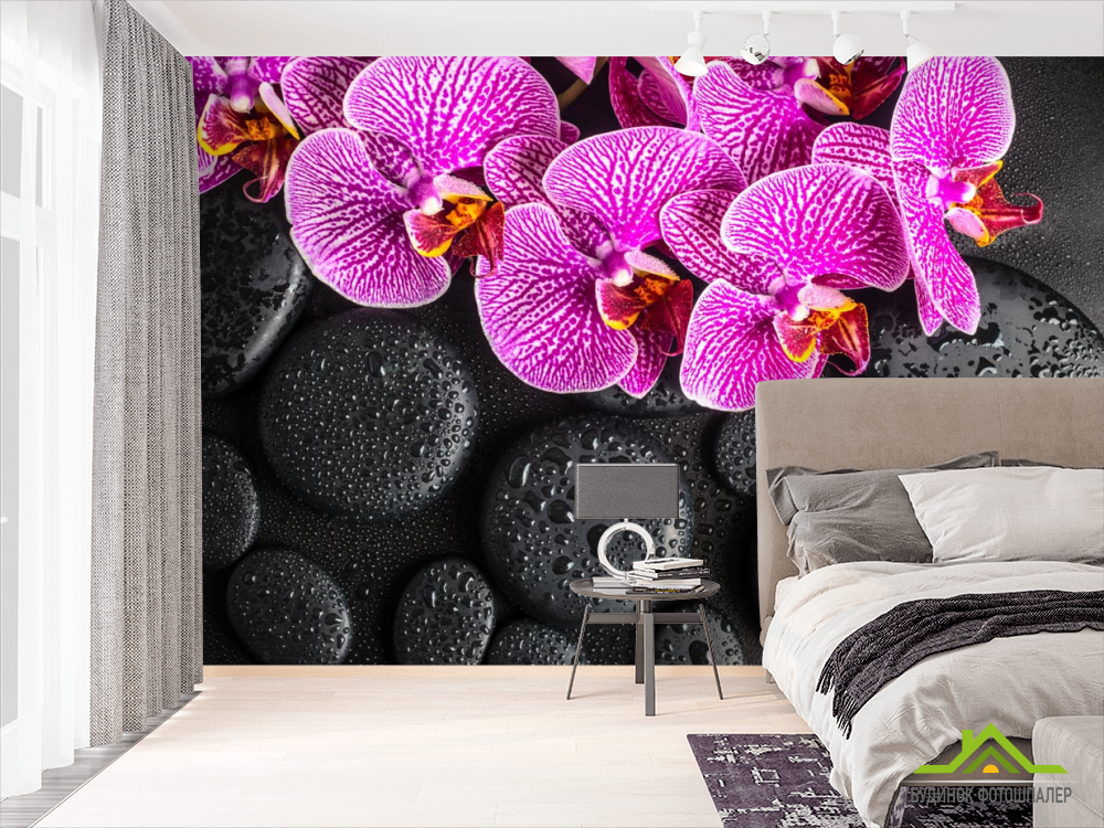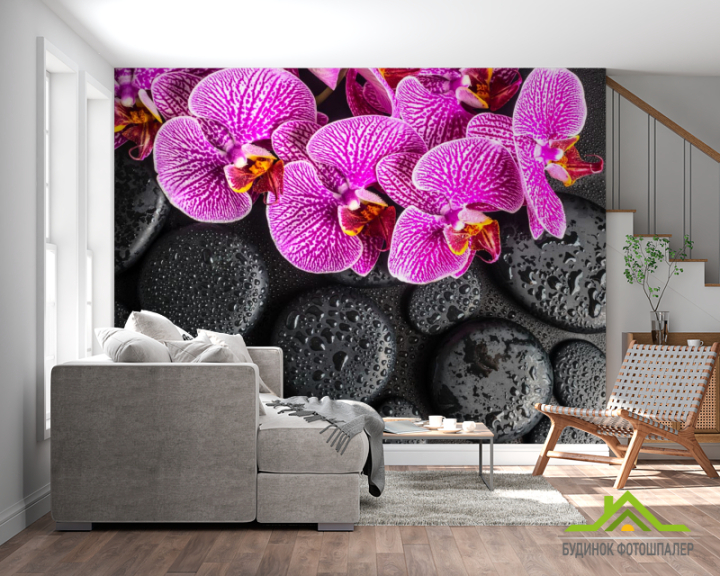 Фотошпалери бузкові орхідеї на чорних каменях з краплями