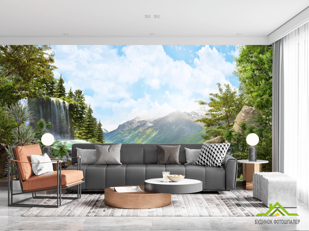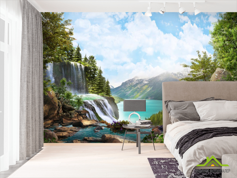 Фотошпалери водоспад над озером в горах Фотошпалери водоспад над озером в горах