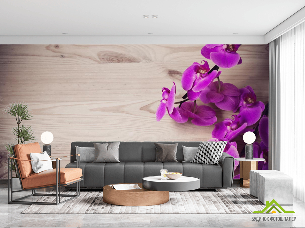 Фотошпалери фіолетова орхідея на дерев'яному тлі Фотошпалери фіолетова орхідея на дерев'яному тлі