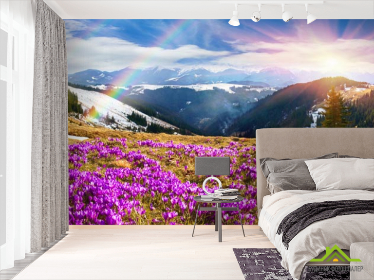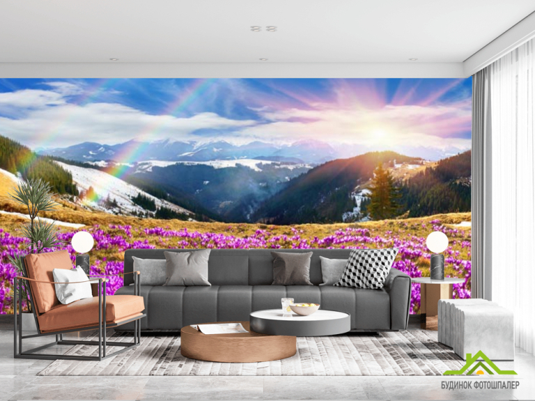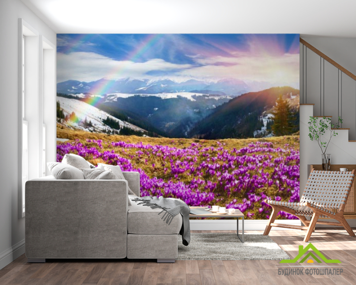 Фотошпалери поляна з бузковими квітами в горах