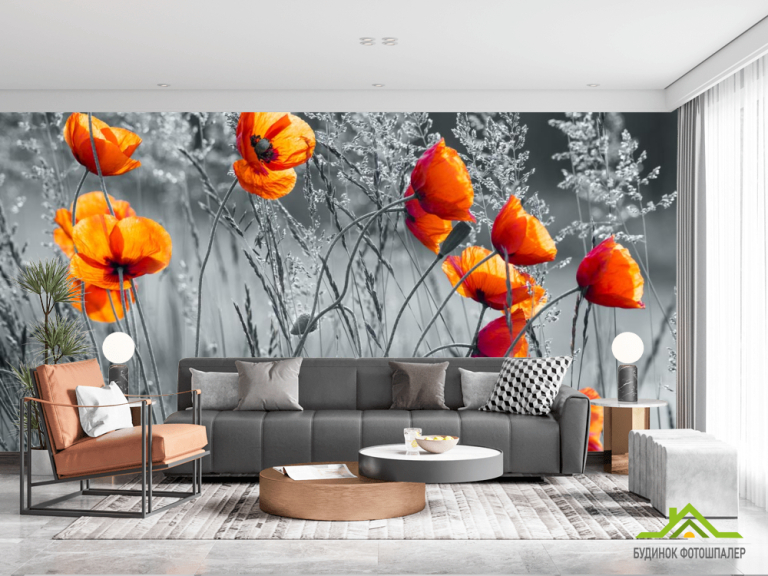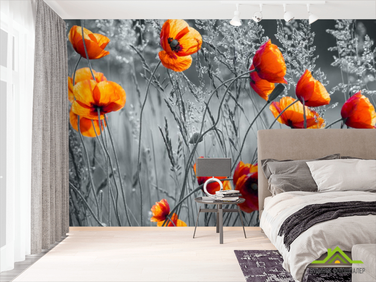 Фотошпалери червоні маки на чорно-білому тлі