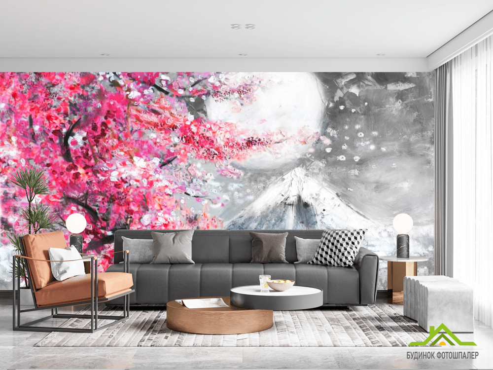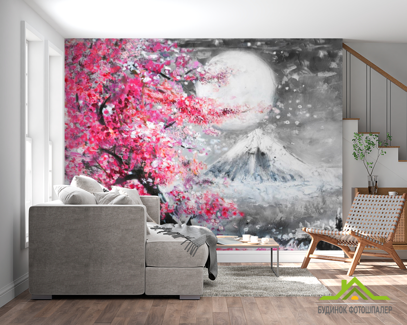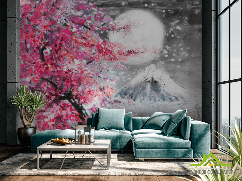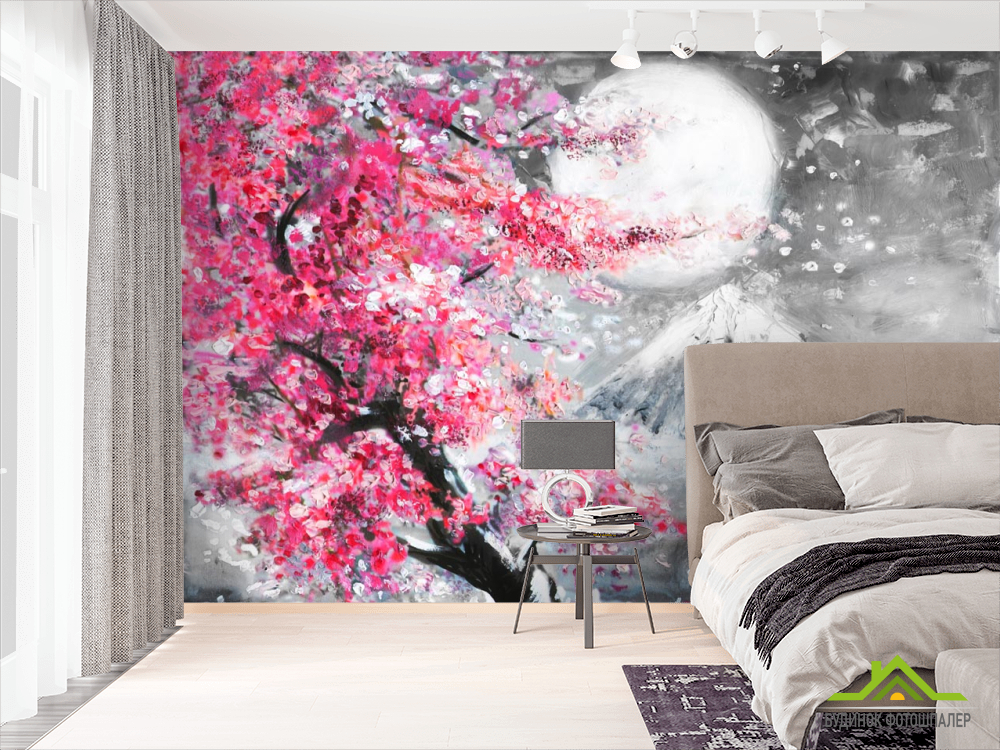 Фотошпалери картина біла луна над рожевим деревом Фотошпалери картина біла луна над рожевим деревом