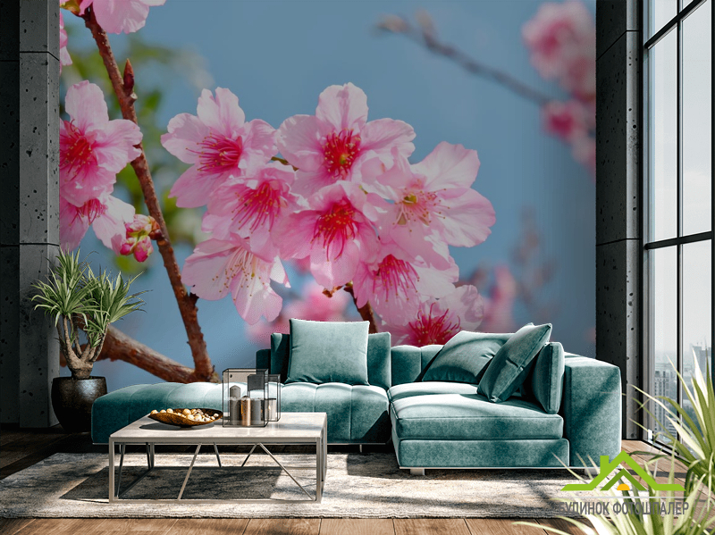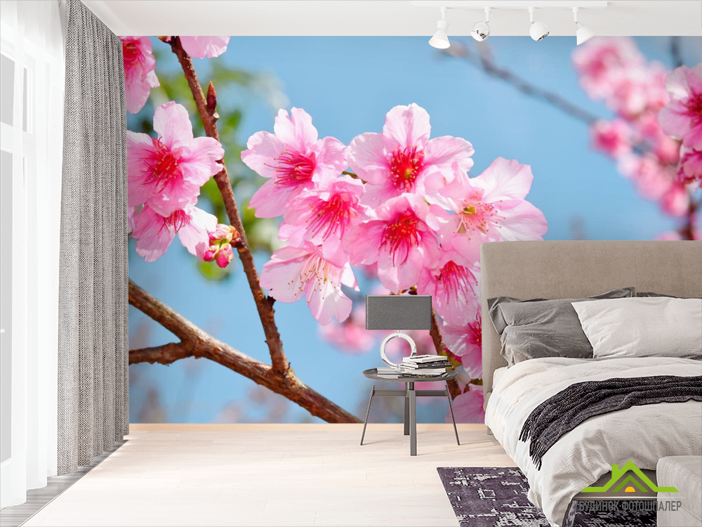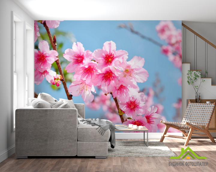Фотошпалери яскраві рожеві квіточки на дереві Фотошпалери яскраві рожеві квіточки на дереві