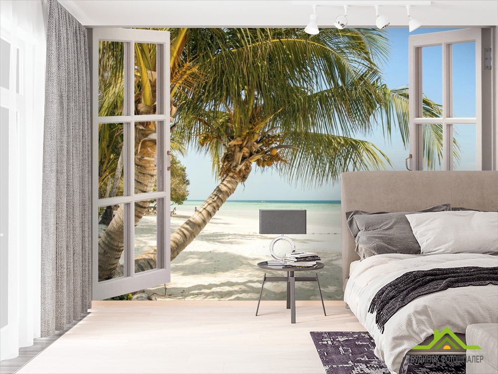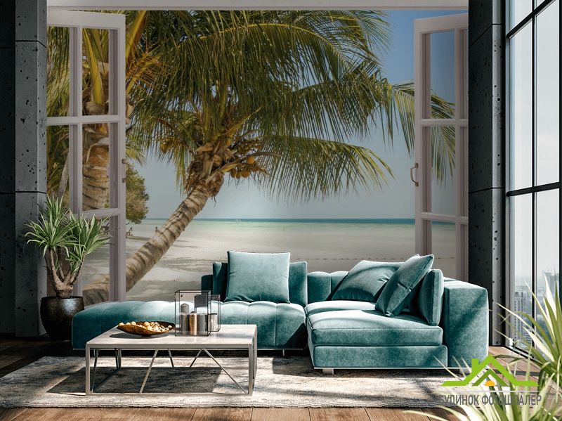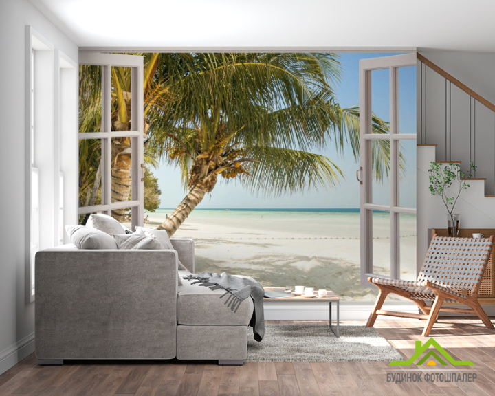 Фотошпалери Пальма і море у вікні Фотошпалери Пальма і море у вікні