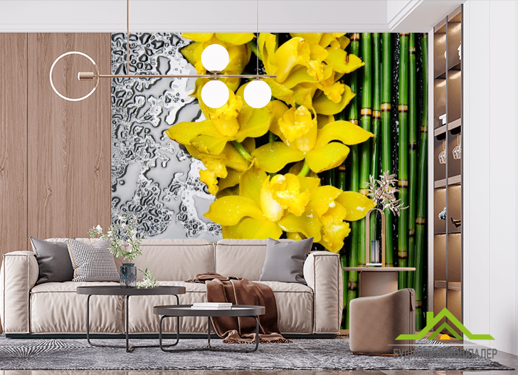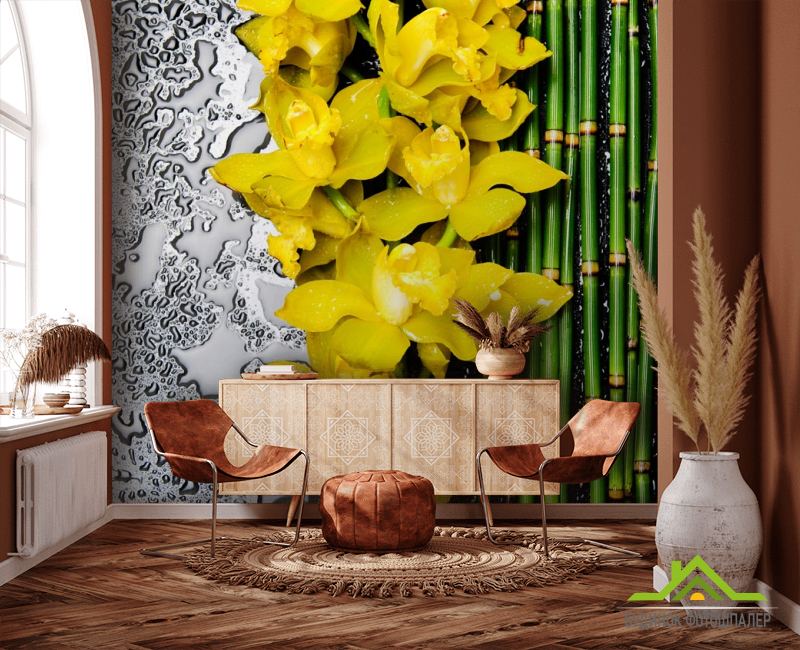 Фотошпалери жовта орхідея з бамбуком і водою Фотошпалери жовта орхідея з бамбуком і водою