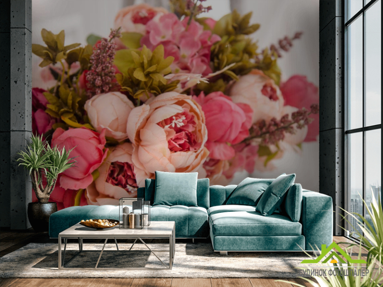 Фотошпалери рожевий букет вкорзине Фотошпалери рожевий букет вкорзине