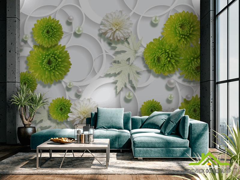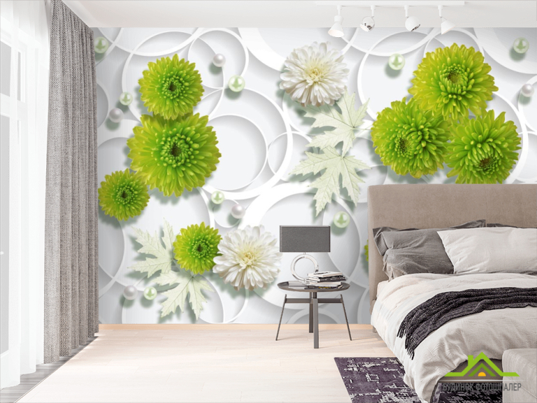Фотошпалери зелені квіти на тлі білих кіл Фотошпалери зелені квіти на тлі білих кіл