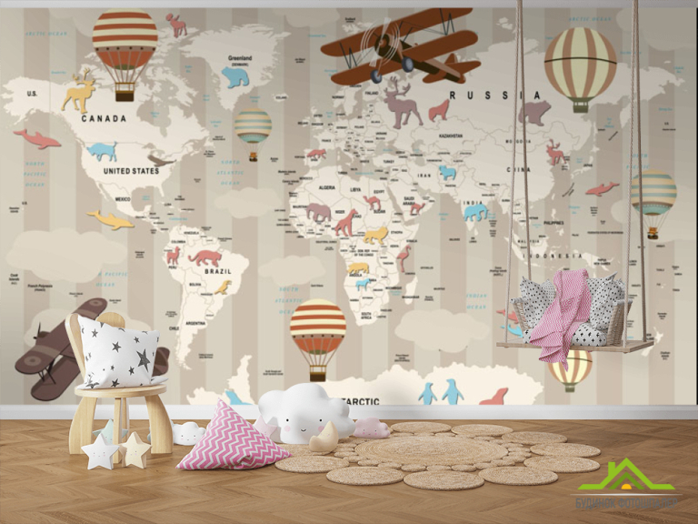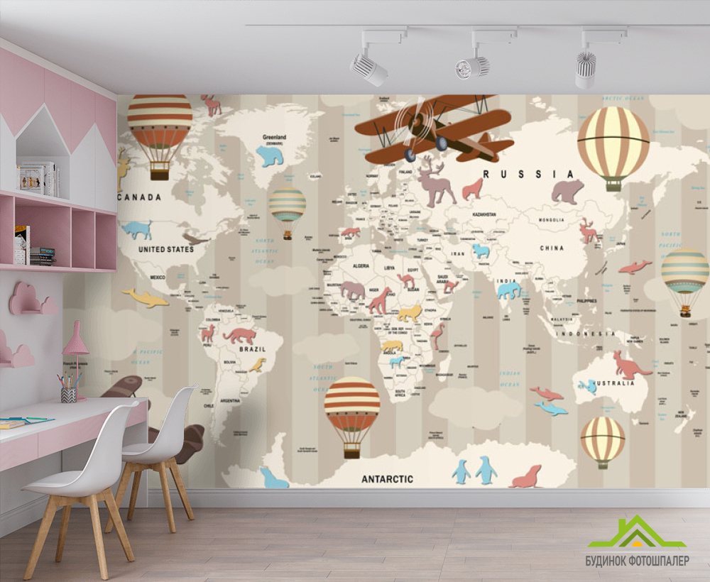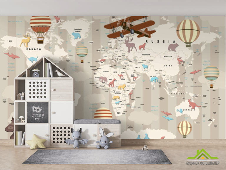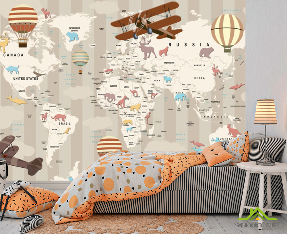 Фотообои карта мира с животными и самолетами Фотообои карта мира с животными и самолетами