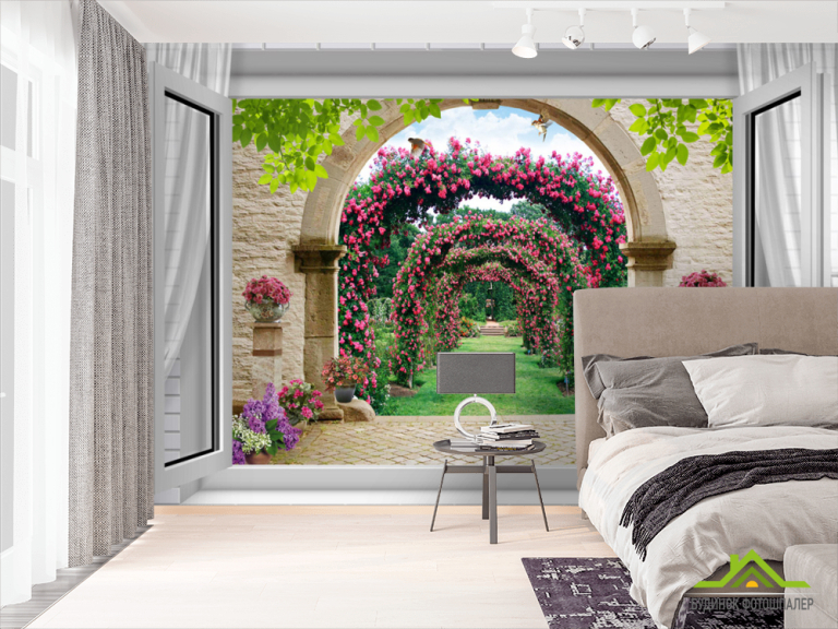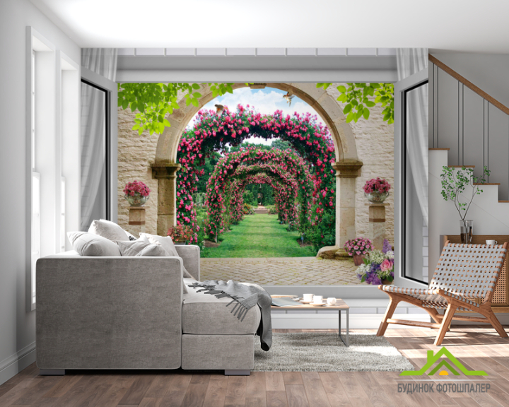 Фотошпалери Вид з вікна на сад з трояндами Фотошпалери Вид з вікна на сад з трояндами