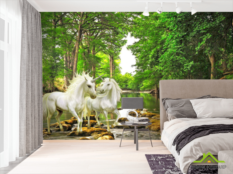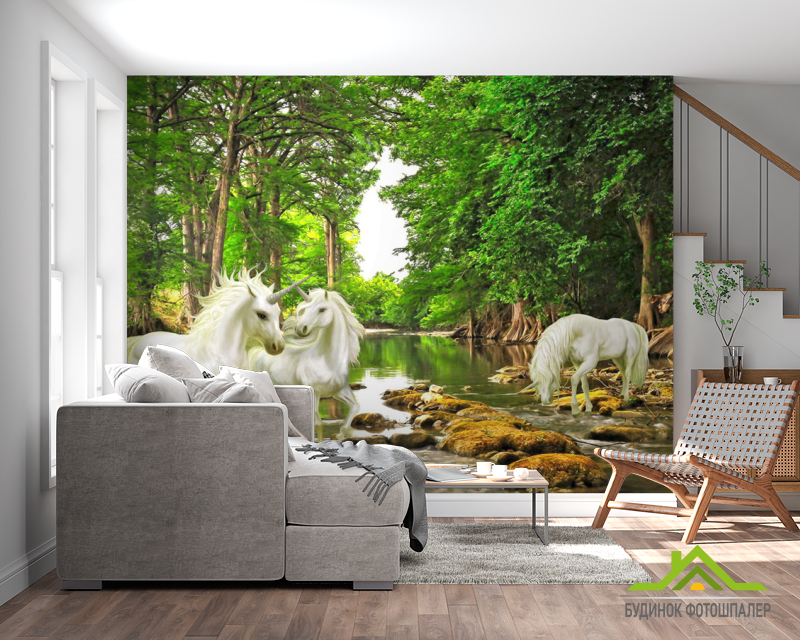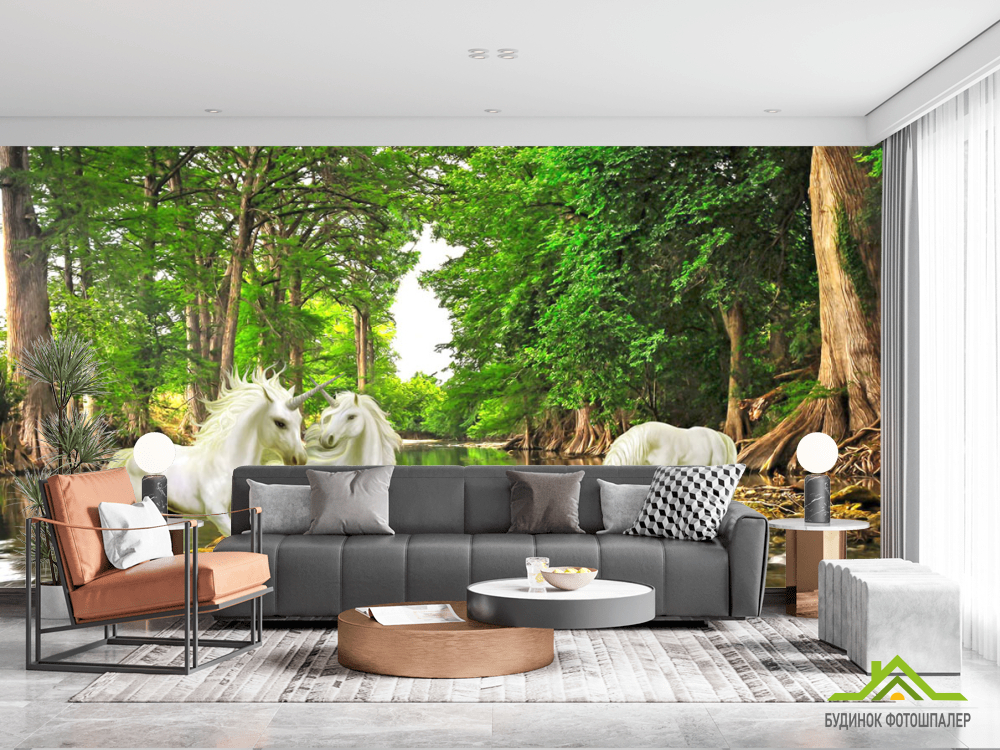 Фотошпалери Білі єдинороги в лісі Фотошпалери Білі єдинороги в лісі