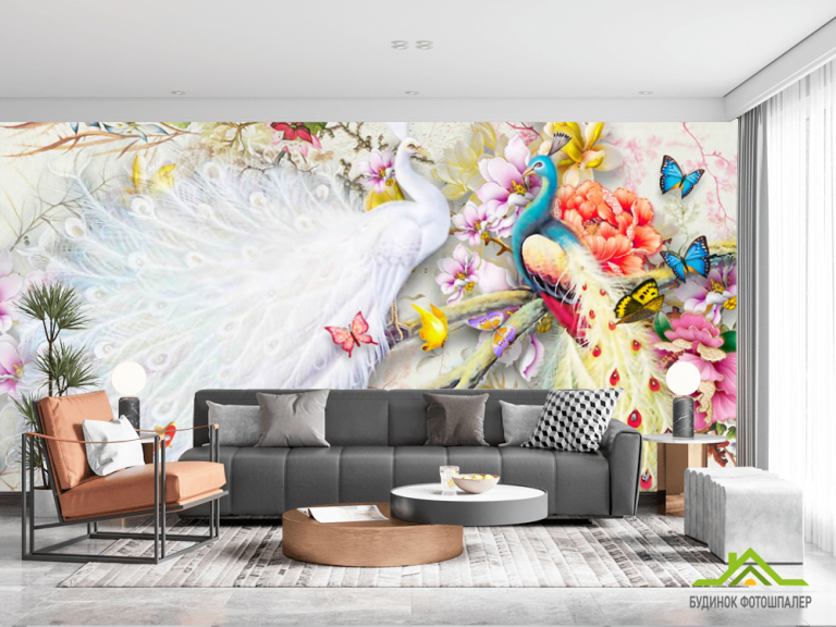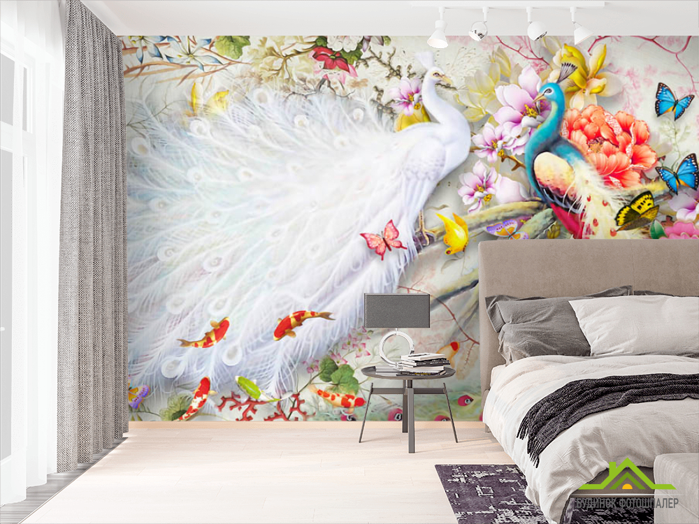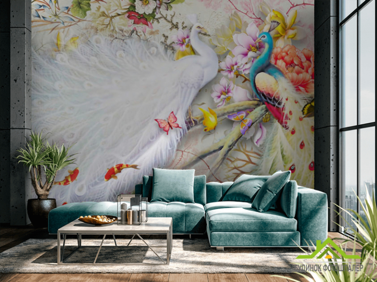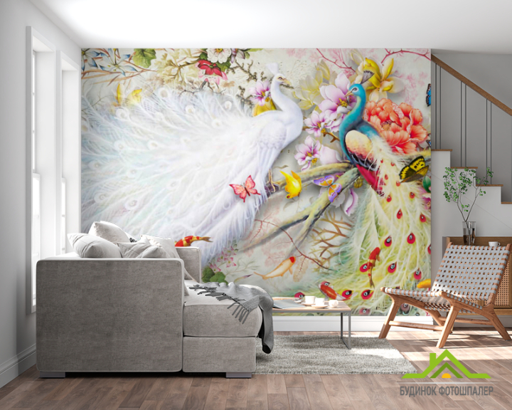 Фотошпалери Два шикарних павича в японському стилі Фотошпалери Два шикарних павича в японському стилі