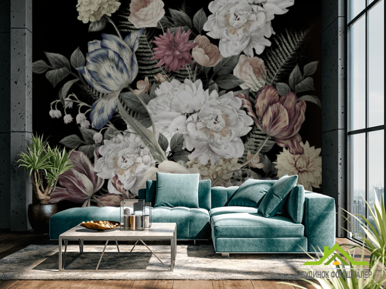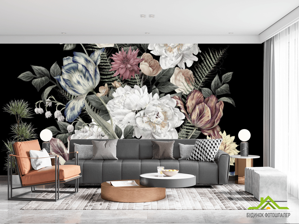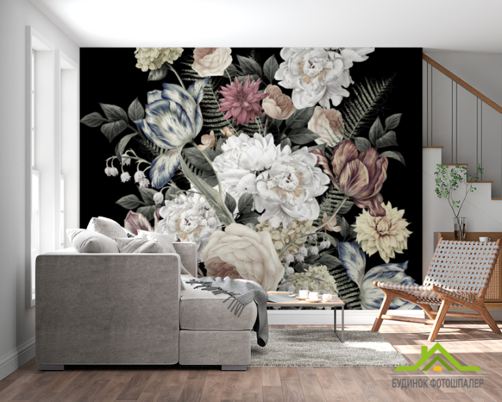 Фотошпалери Вінтажні квіти на чорному тлі Фотошпалери Вінтажні квіти на чорному тлі