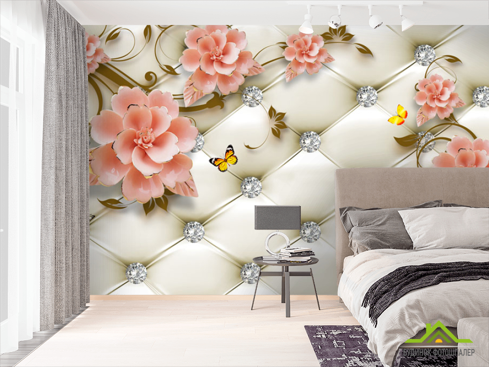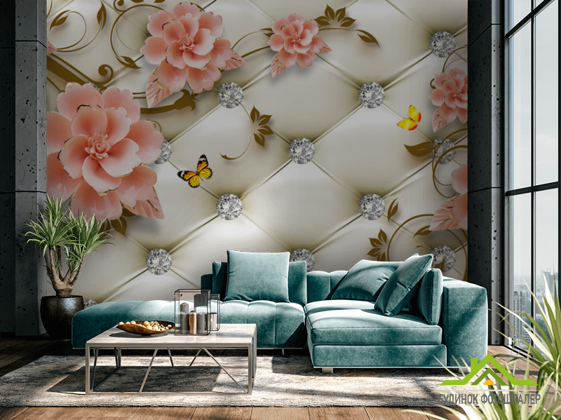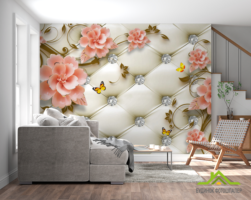 Фотошпалери Керамічні квіти на тлі оббивки Фотошпалери Керамічні квіти на тлі оббивки