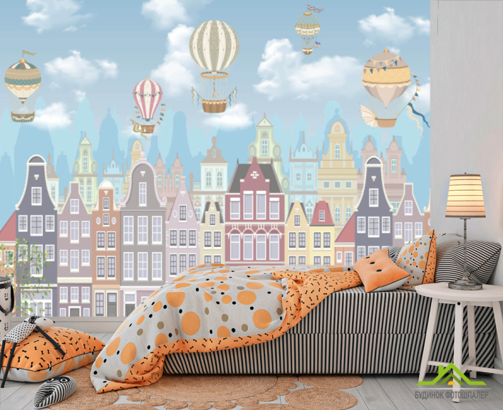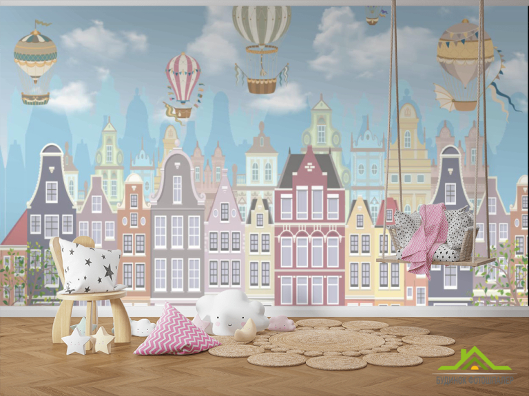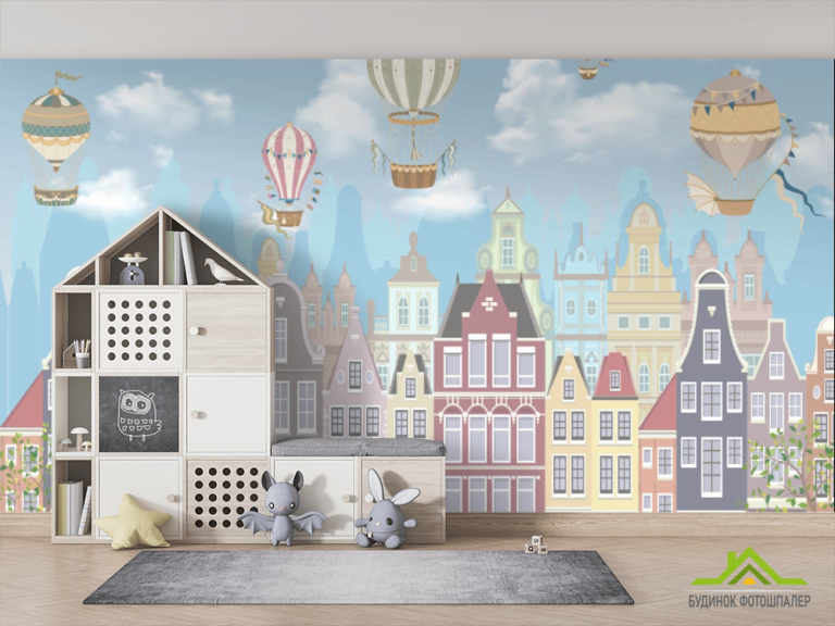 Фотошпалери Повітряні кулі над будиночками Фотошпалери Повітряні кулі над будиночками