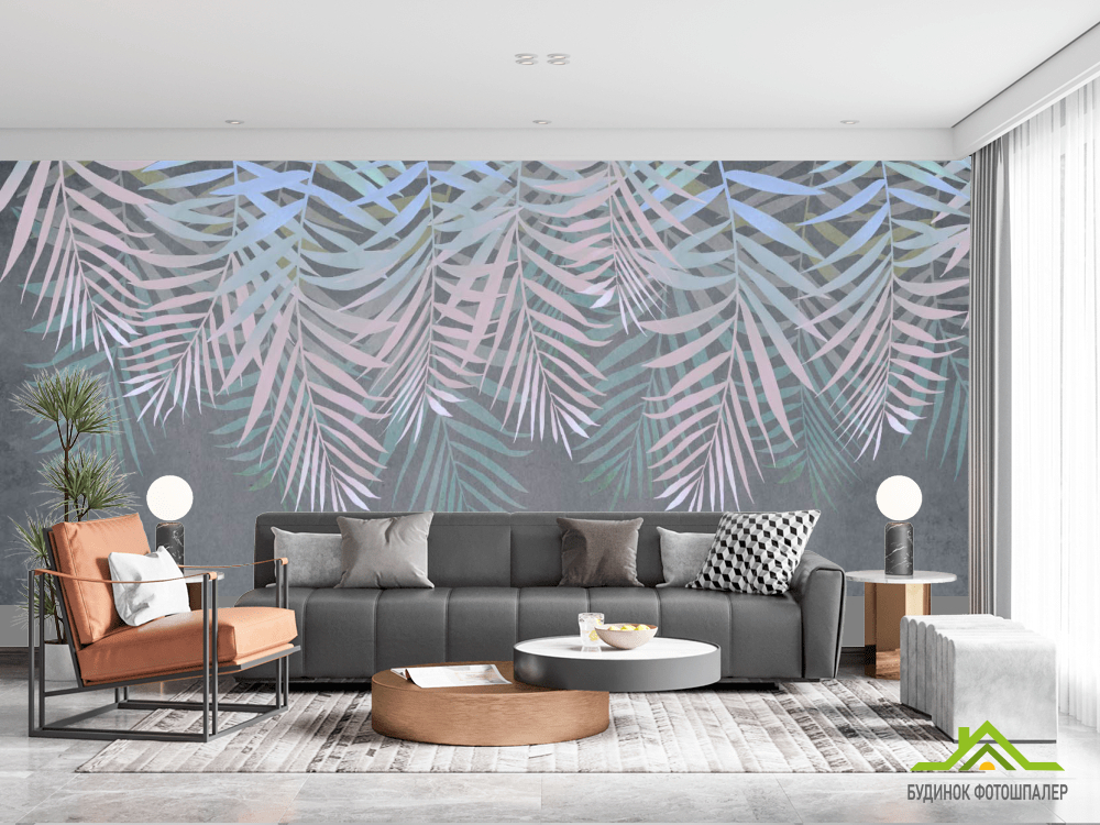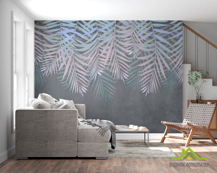 Фотошпалери Листя зі стелі на сірому Фотошпалери Листя зі стелі на сірому