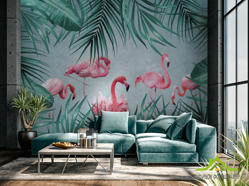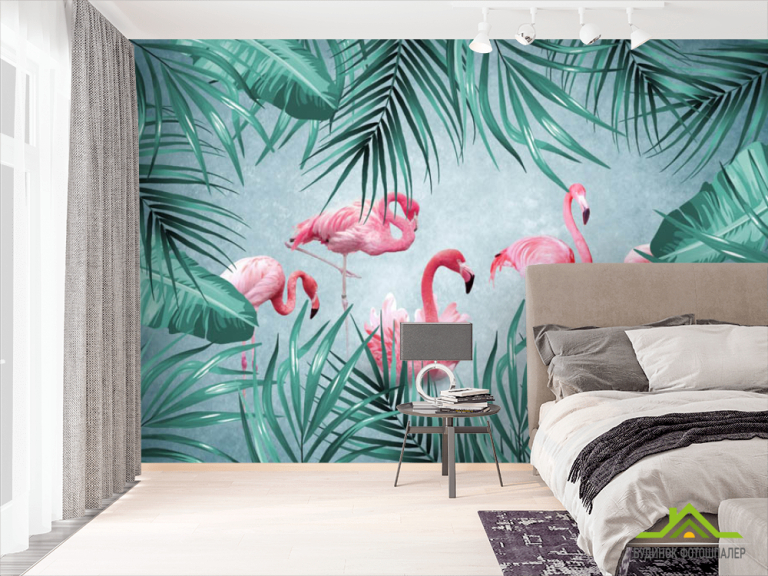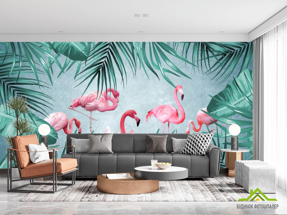 Фотошпалери фламінго на тропічних листках Фотошпалери фламінго на тропічних листках